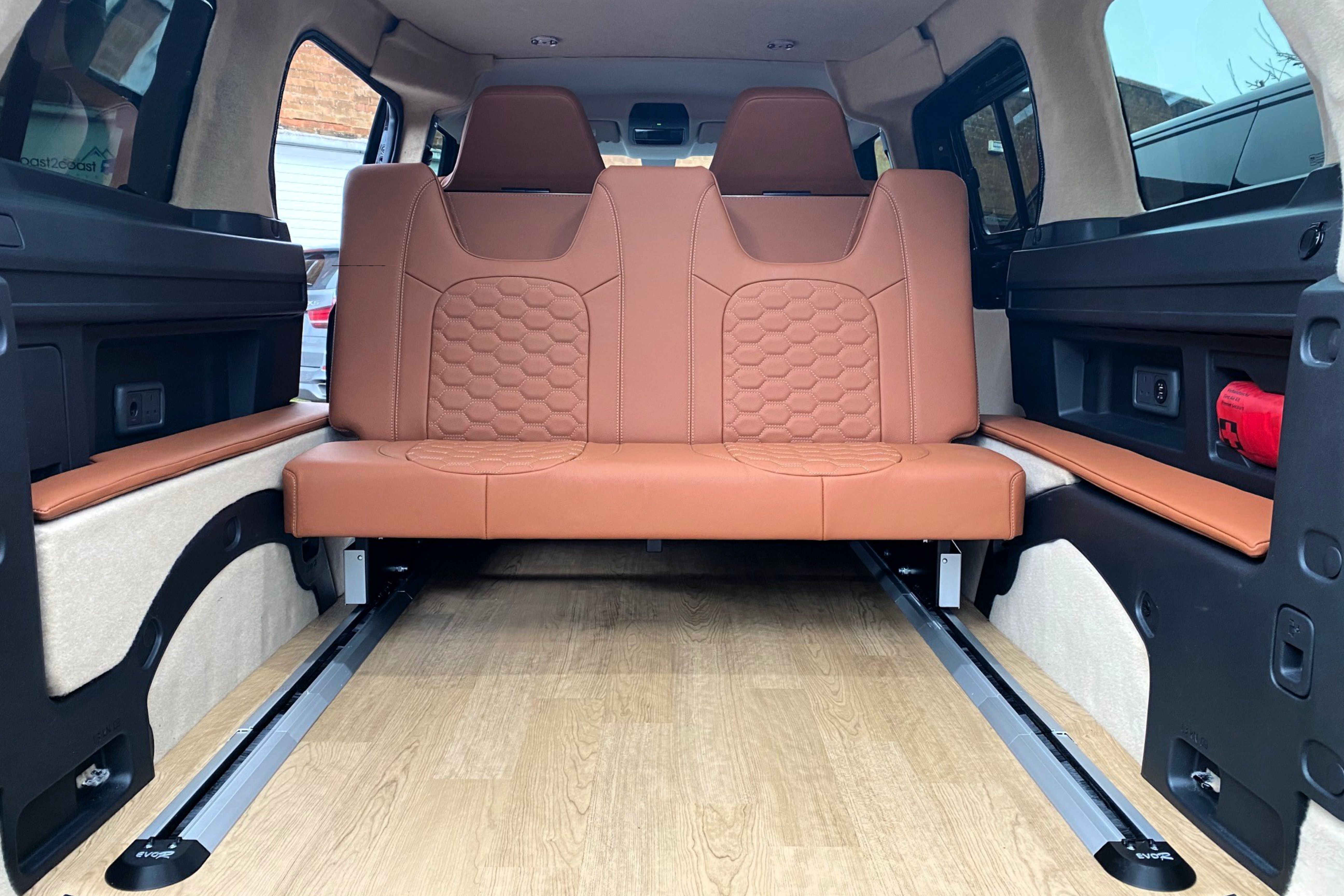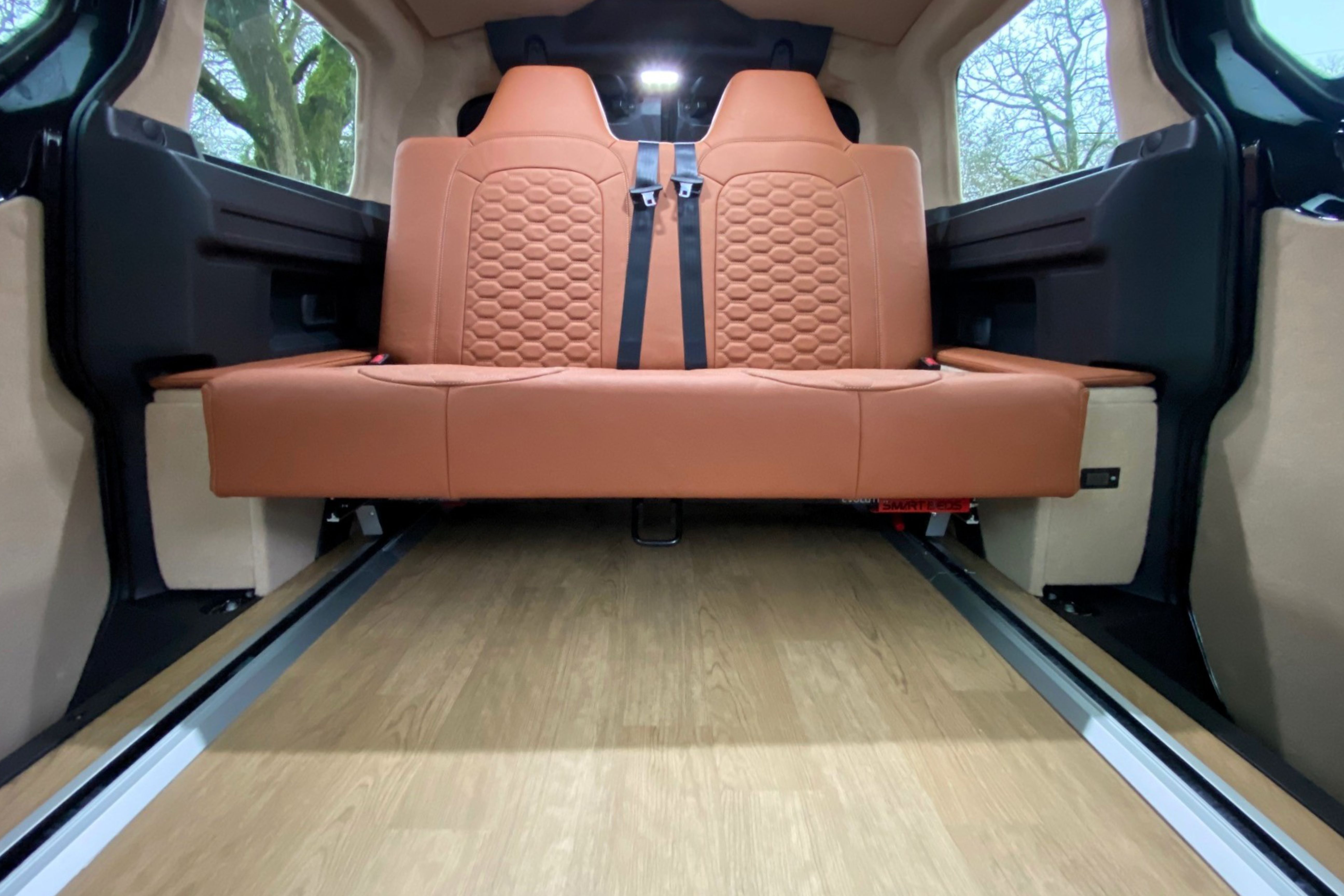 Electric M1 tested 2-seater Rock and Roll bed system upholstered in VW trim, with integrated floor rails