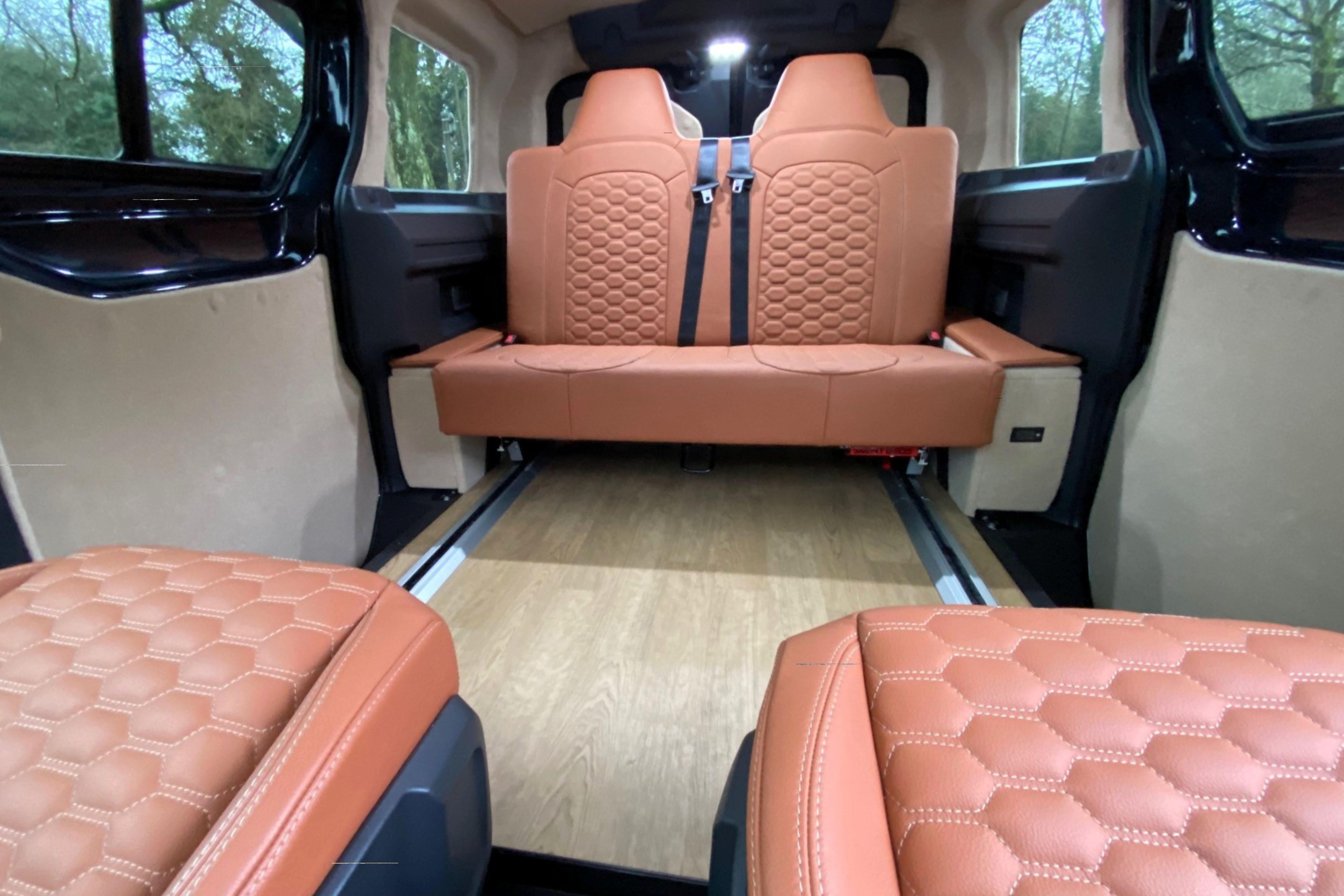 Our Volkswagen ID. Buzz Kombi Sleeper conversion, offering rear travelling seats to a Cargo van in the form of an M1 certified crash tested bed on rail system.