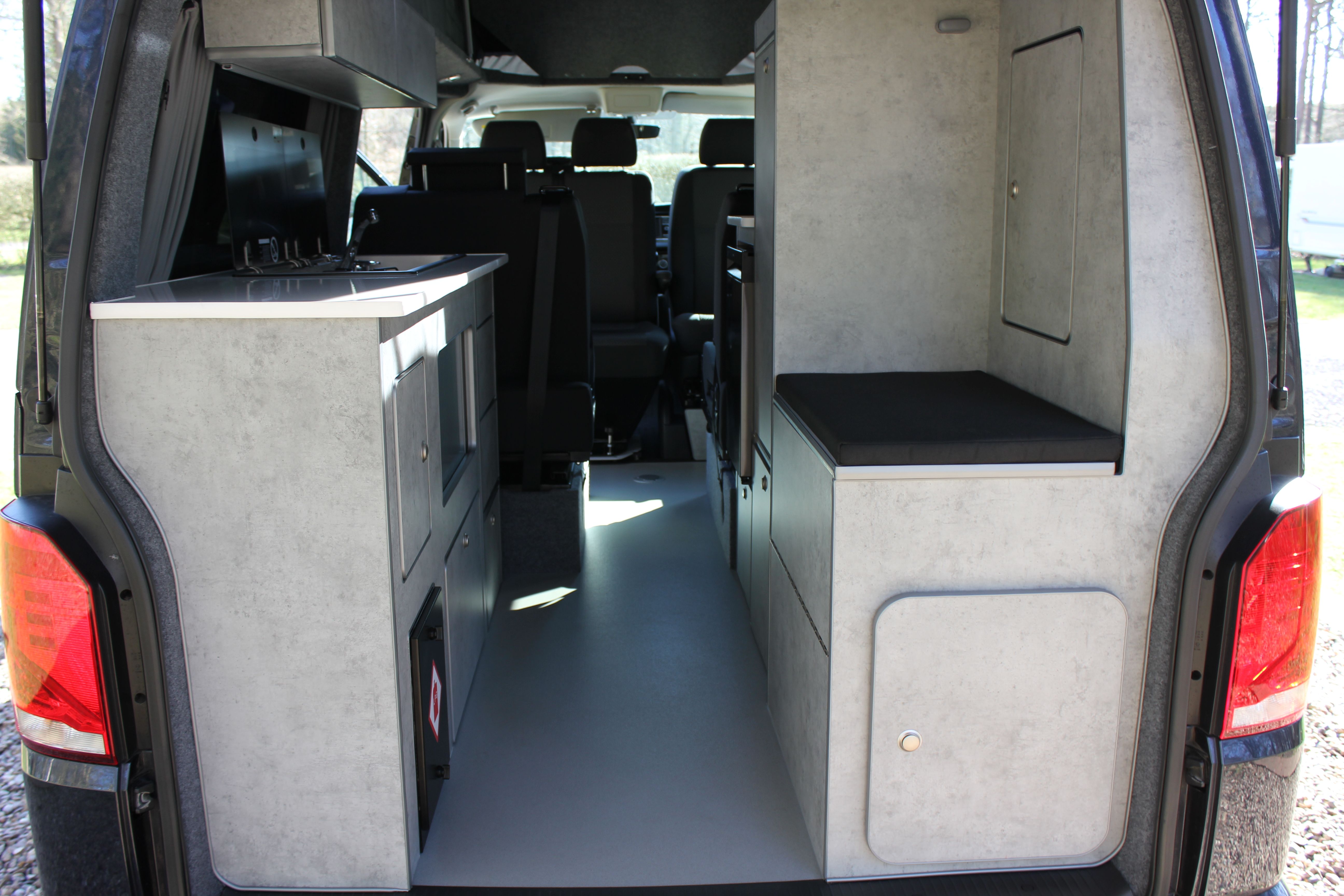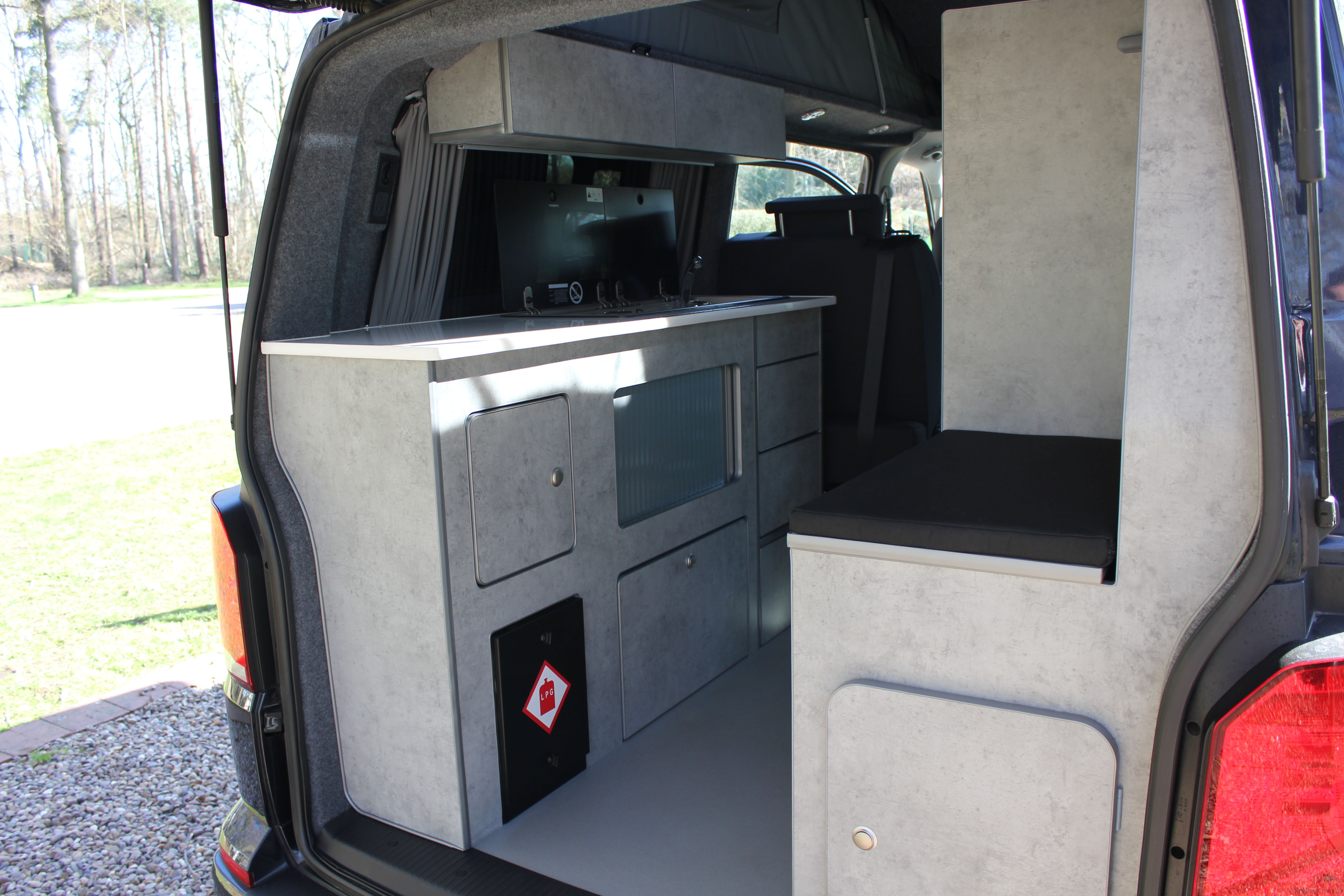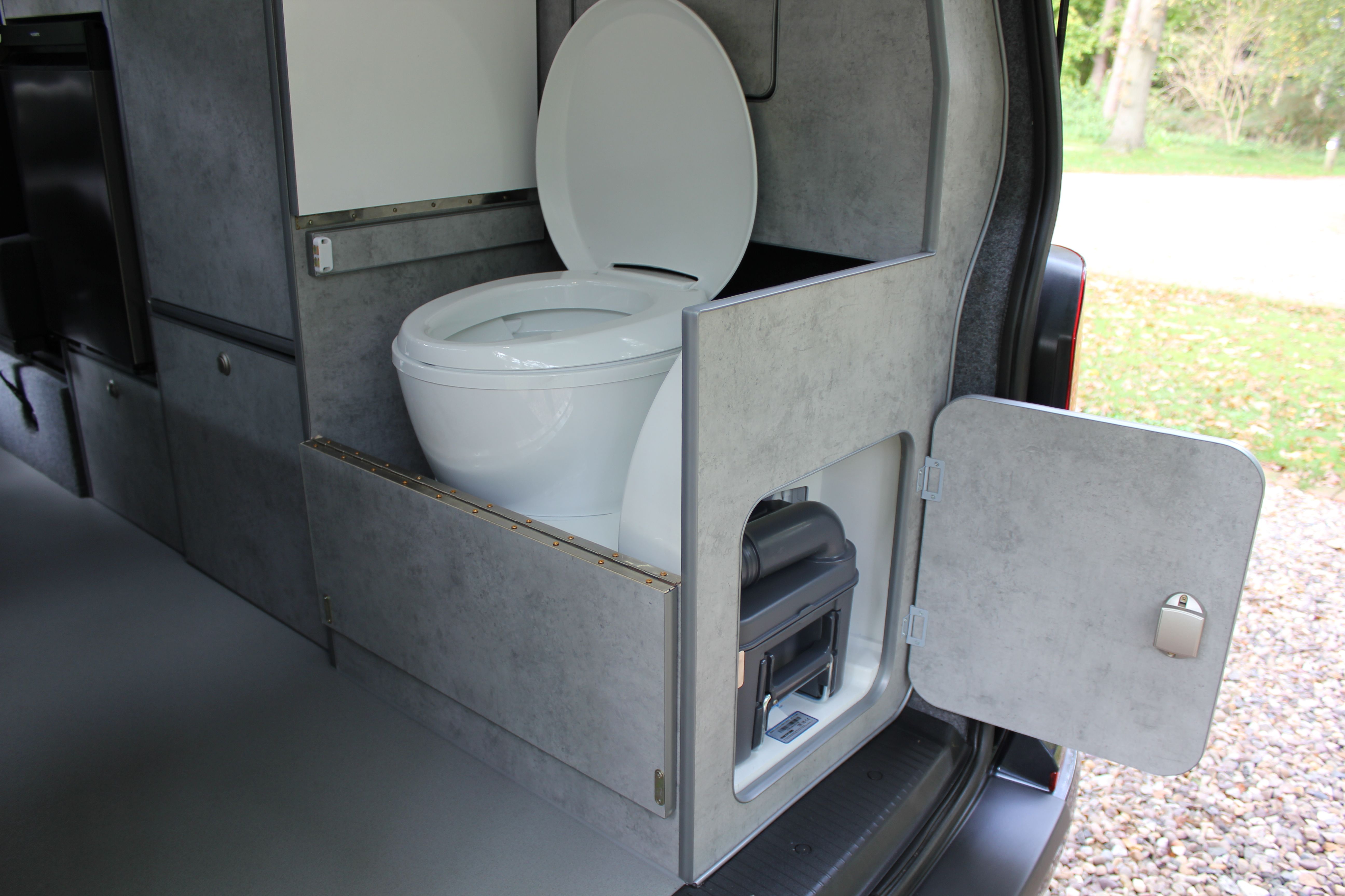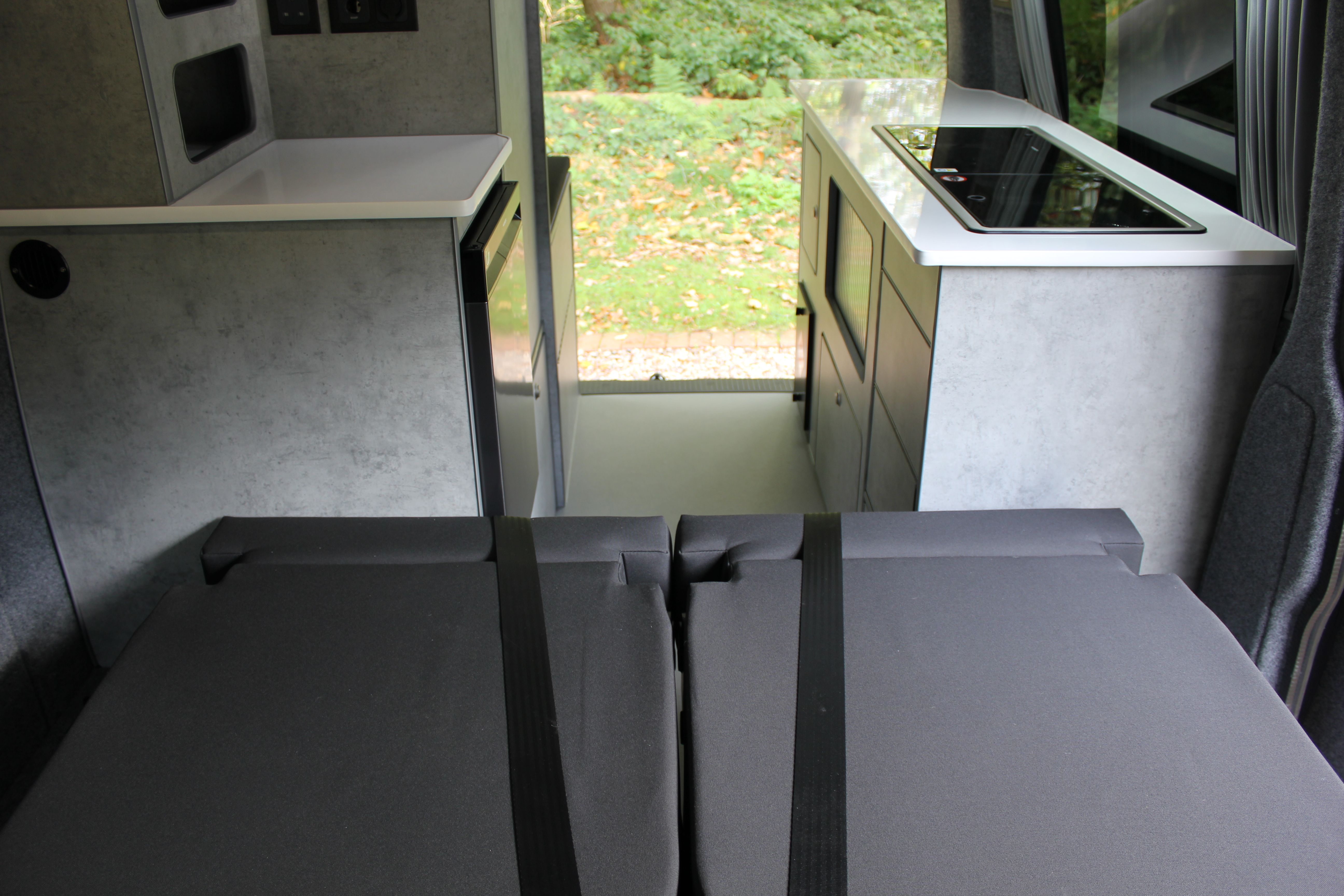 Our Harvington self sufficient camper conversion layout features a rear kitchen area, to offer a more flexible camping layout. Our flagship design with a reverse style layout and rear elevating roof this layout allows for more room at the rear of the campervan giving you a large rear galley style kitchen area with lots of cupboards space. There’s even a fitted flush toilet system!