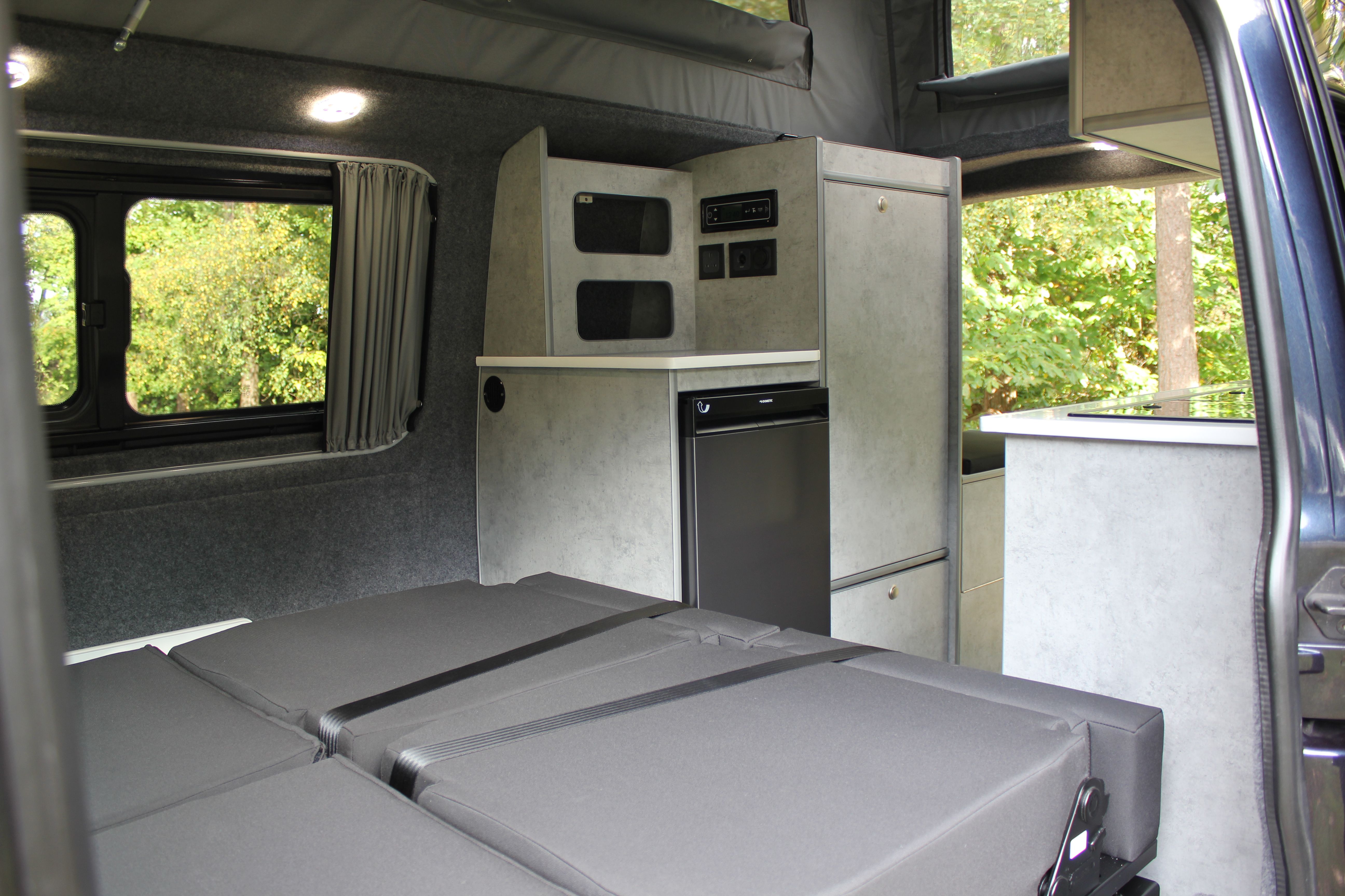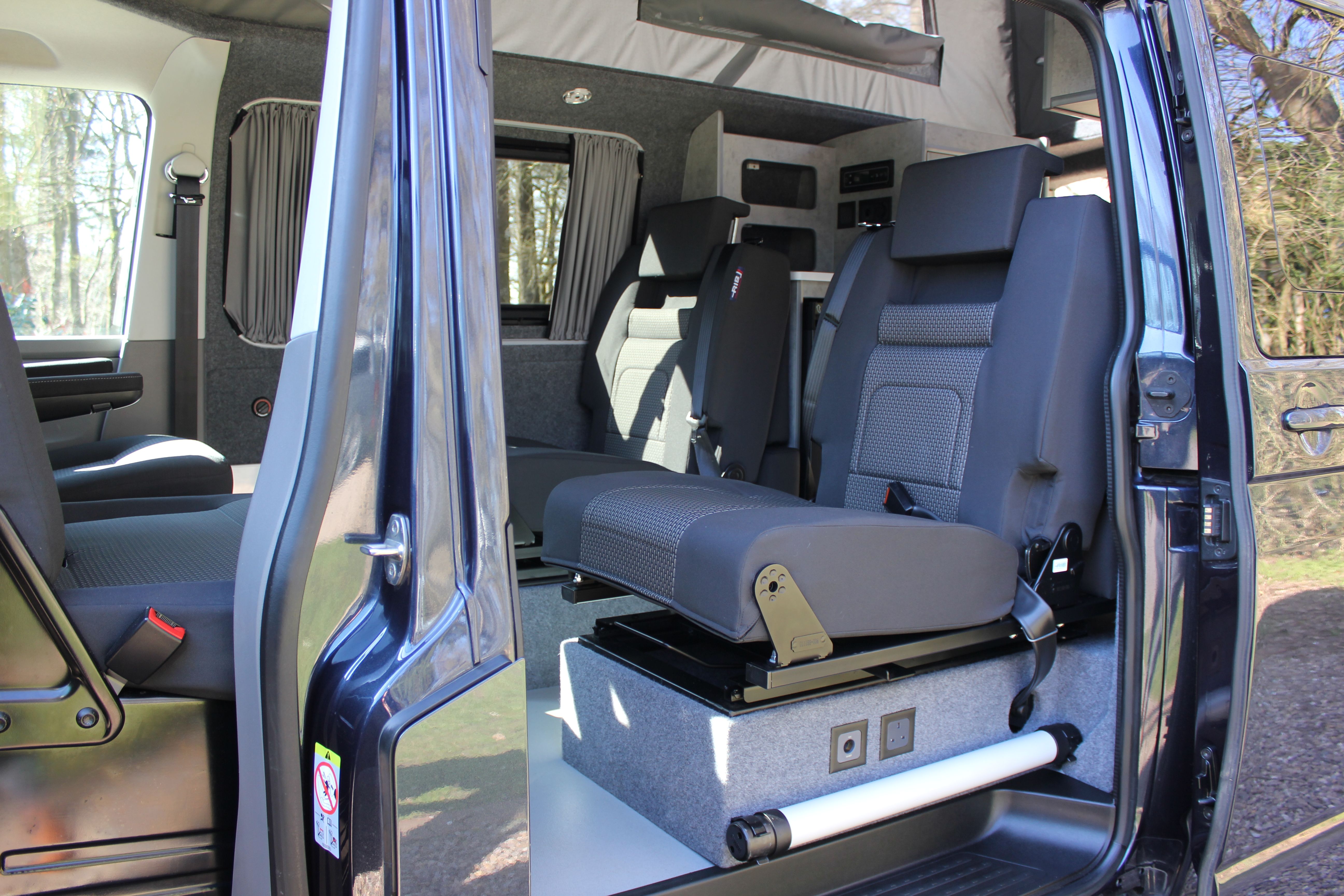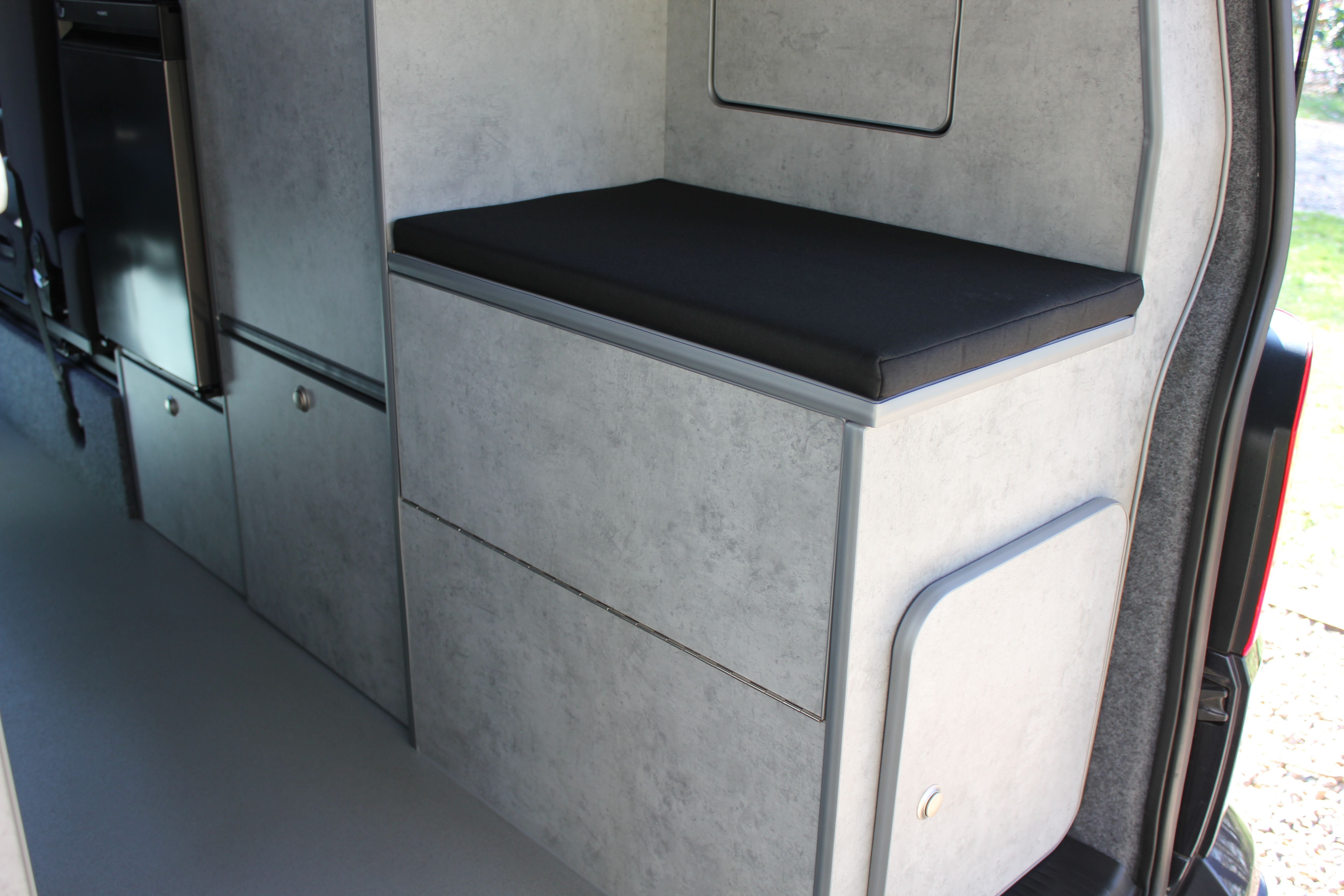 Our Harvington self sufficient camper conversion layout features a rear kitchen area, to offer a more flexible camping layout. Our flagship design with a reverse style layout and rear elevating roof this layout allows for more room at the rear of the campervan giving you a large rear galley style kitchen area with lots of cupboards space. There’s even a fitted flush toilet system!