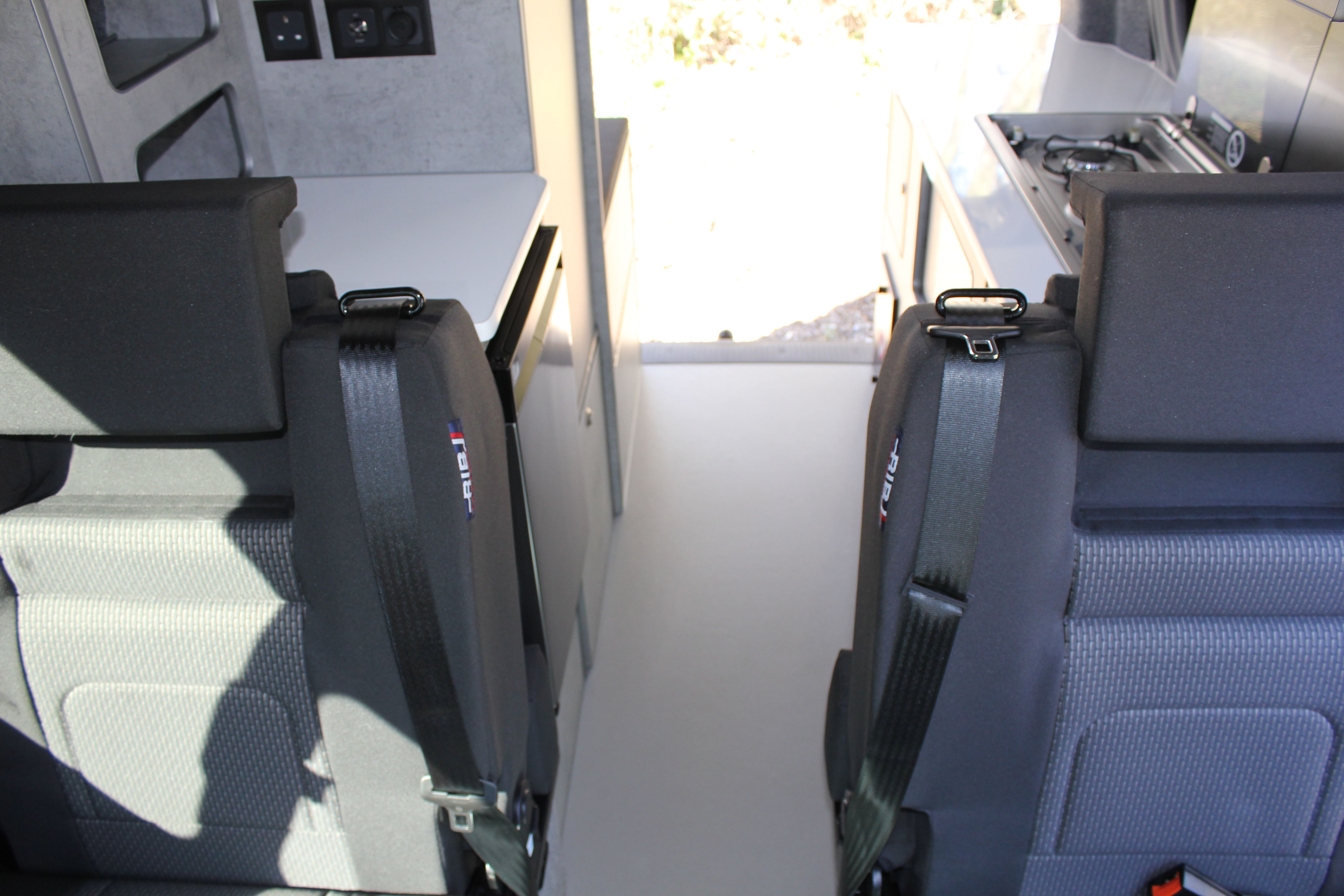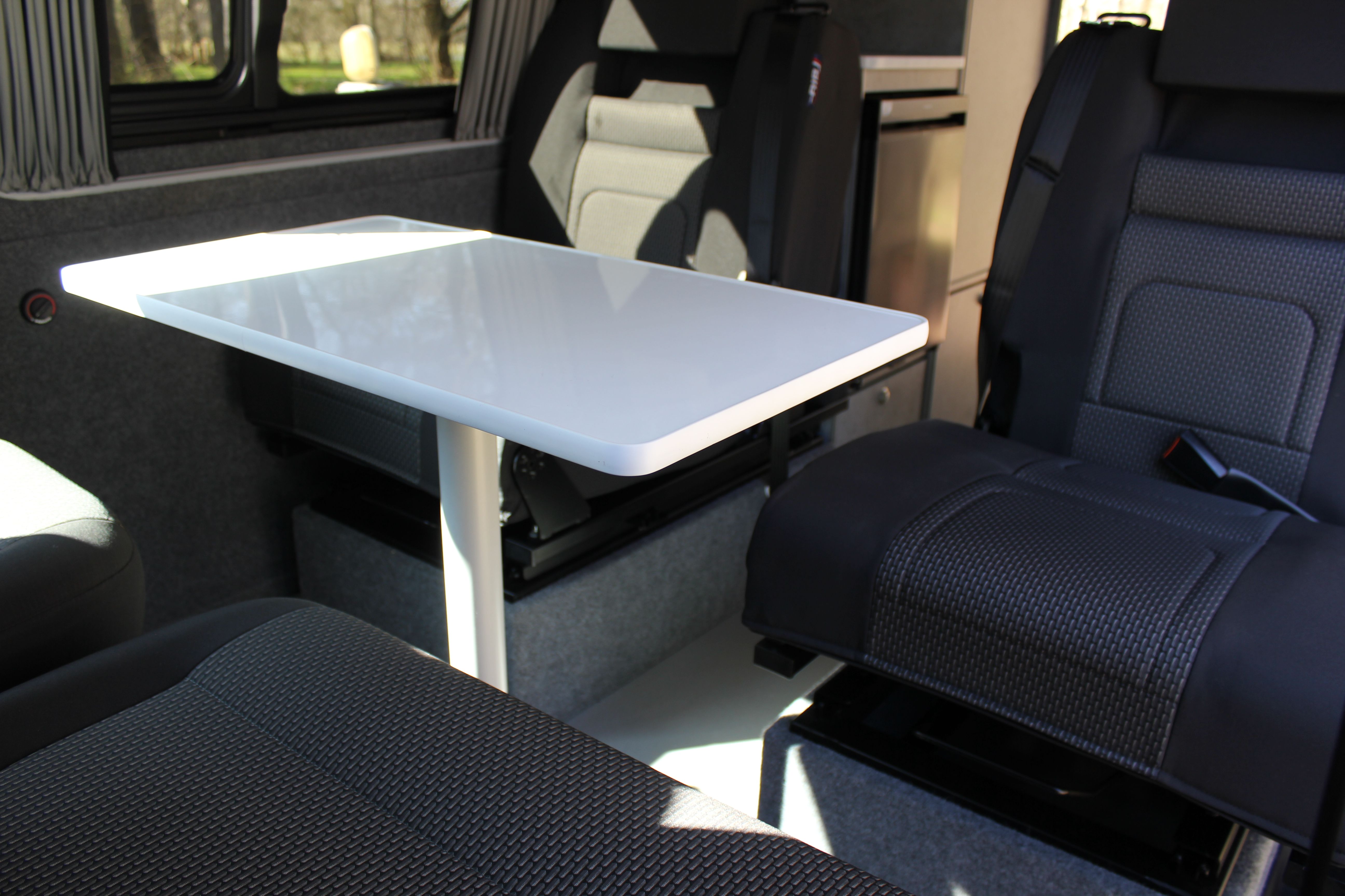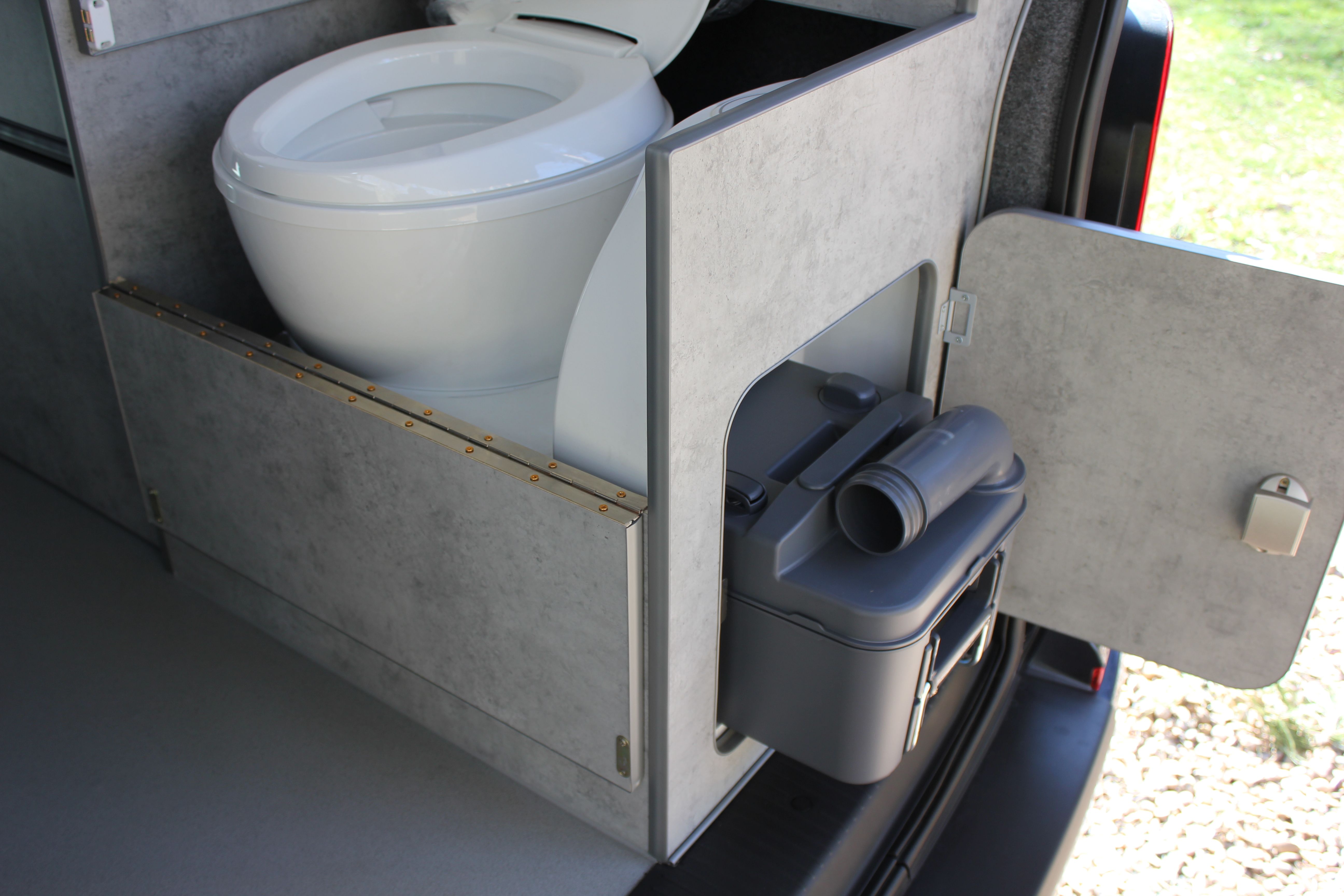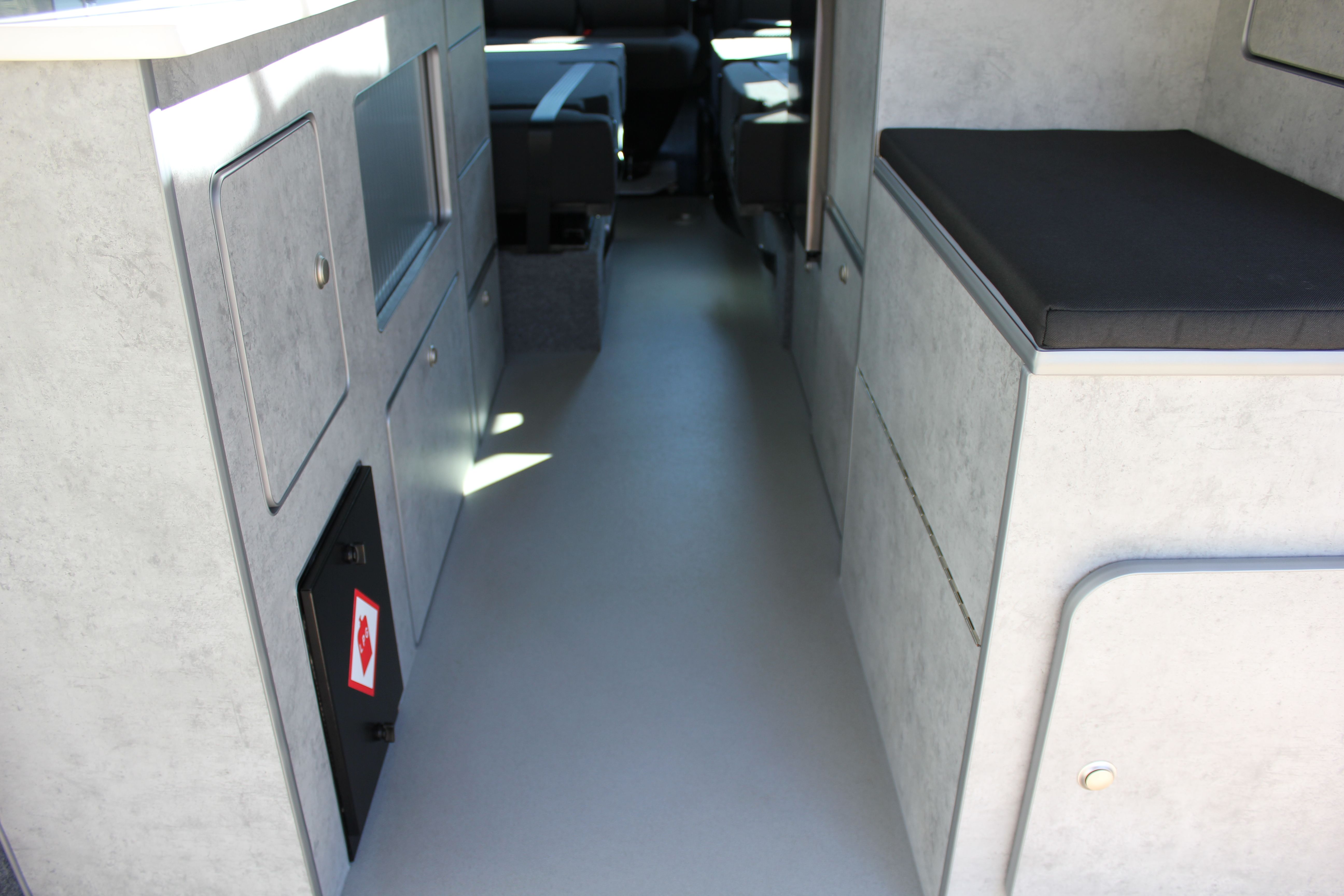 Our Harvington self sufficient camper conversion layout features a rear kitchen area, to offer a more flexible camping layout. Our flagship design with a reverse style layout and rear elevating roof this layout allows for more room at the rear of the campervan giving you a large rear galley style kitchen area with lots of cupboards space. There’s even a fitted flush toilet system!
