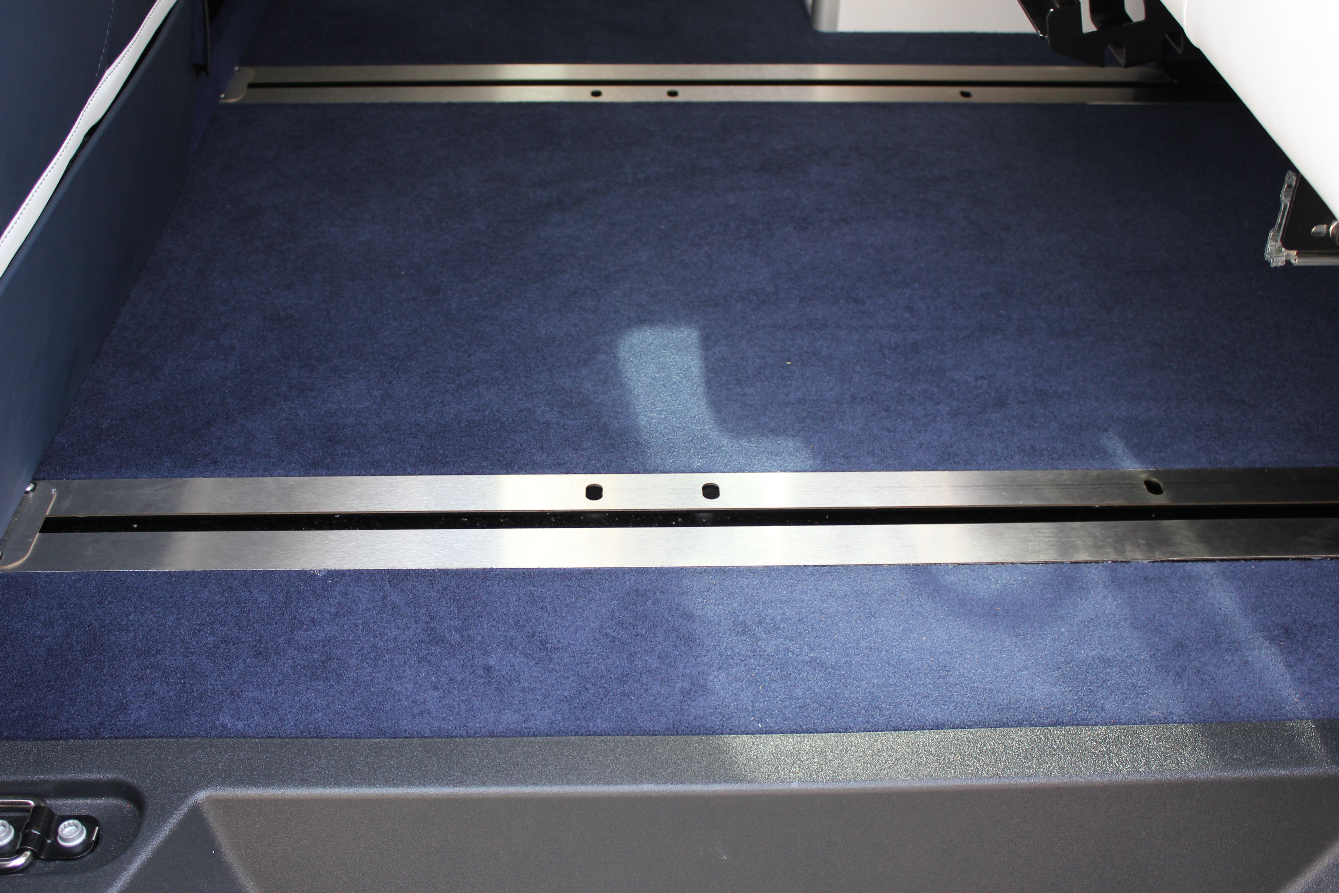 M1 tested central 2-seater Rock and Roll bed system upholstered in VW trim, with integrated floor rails