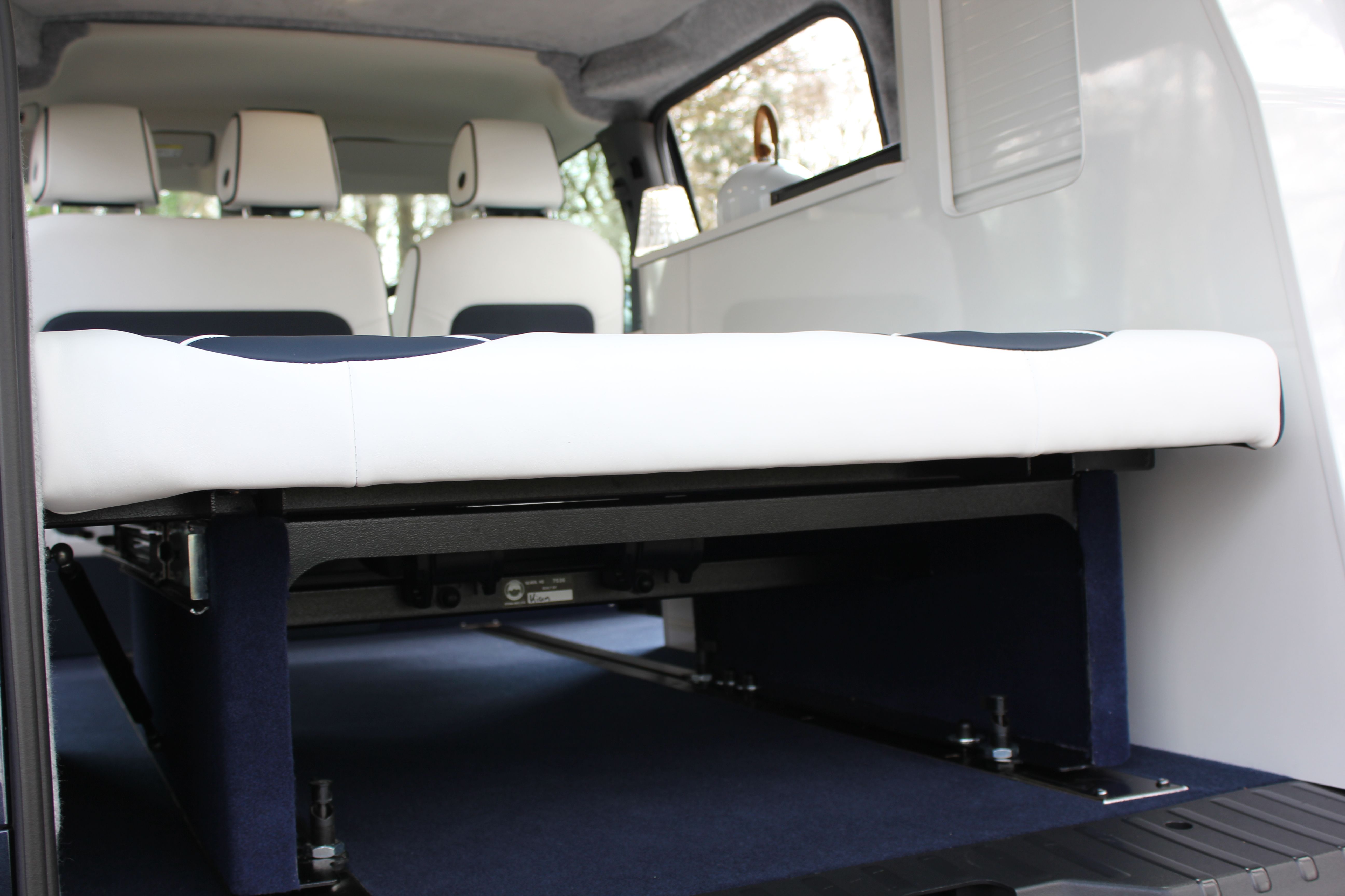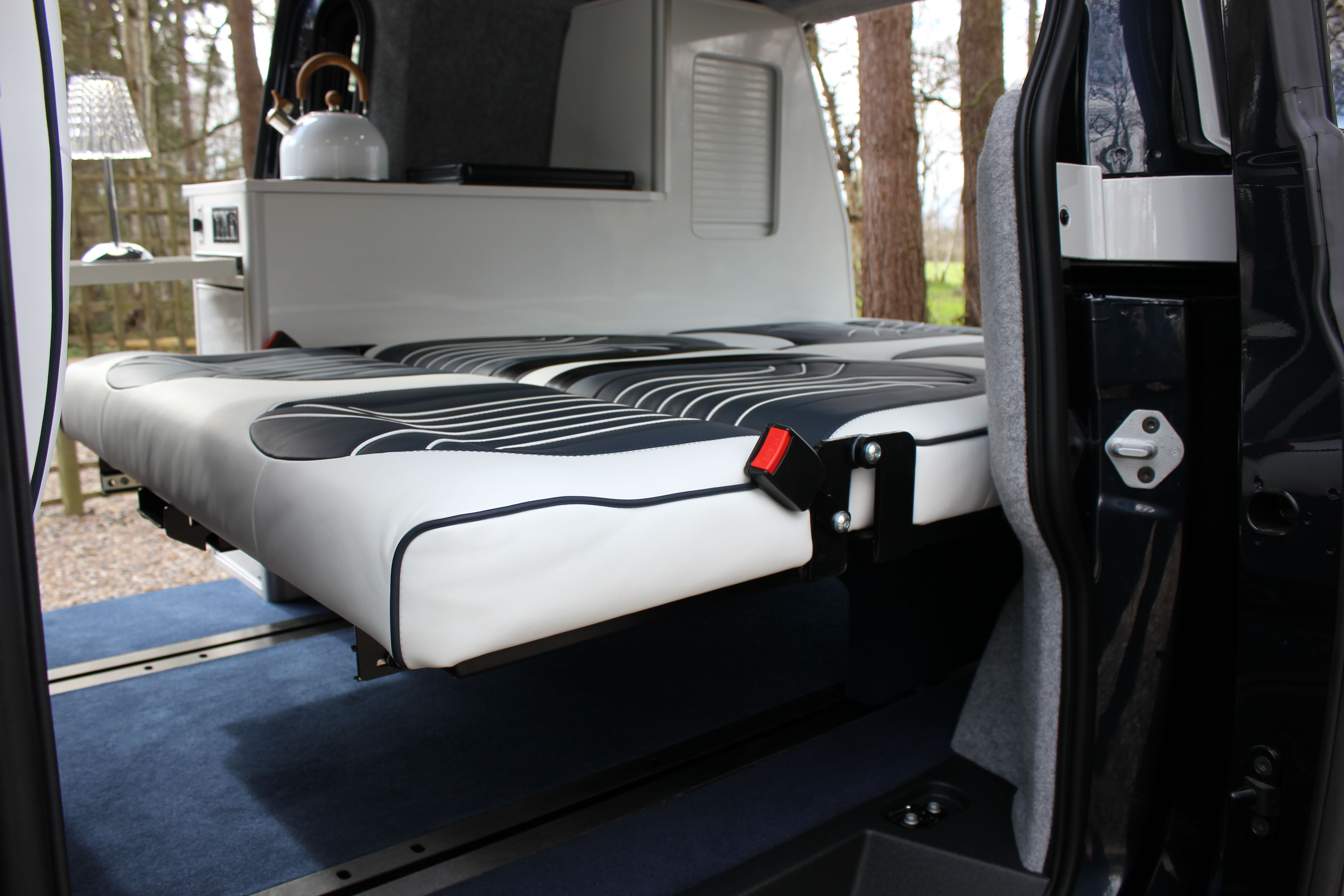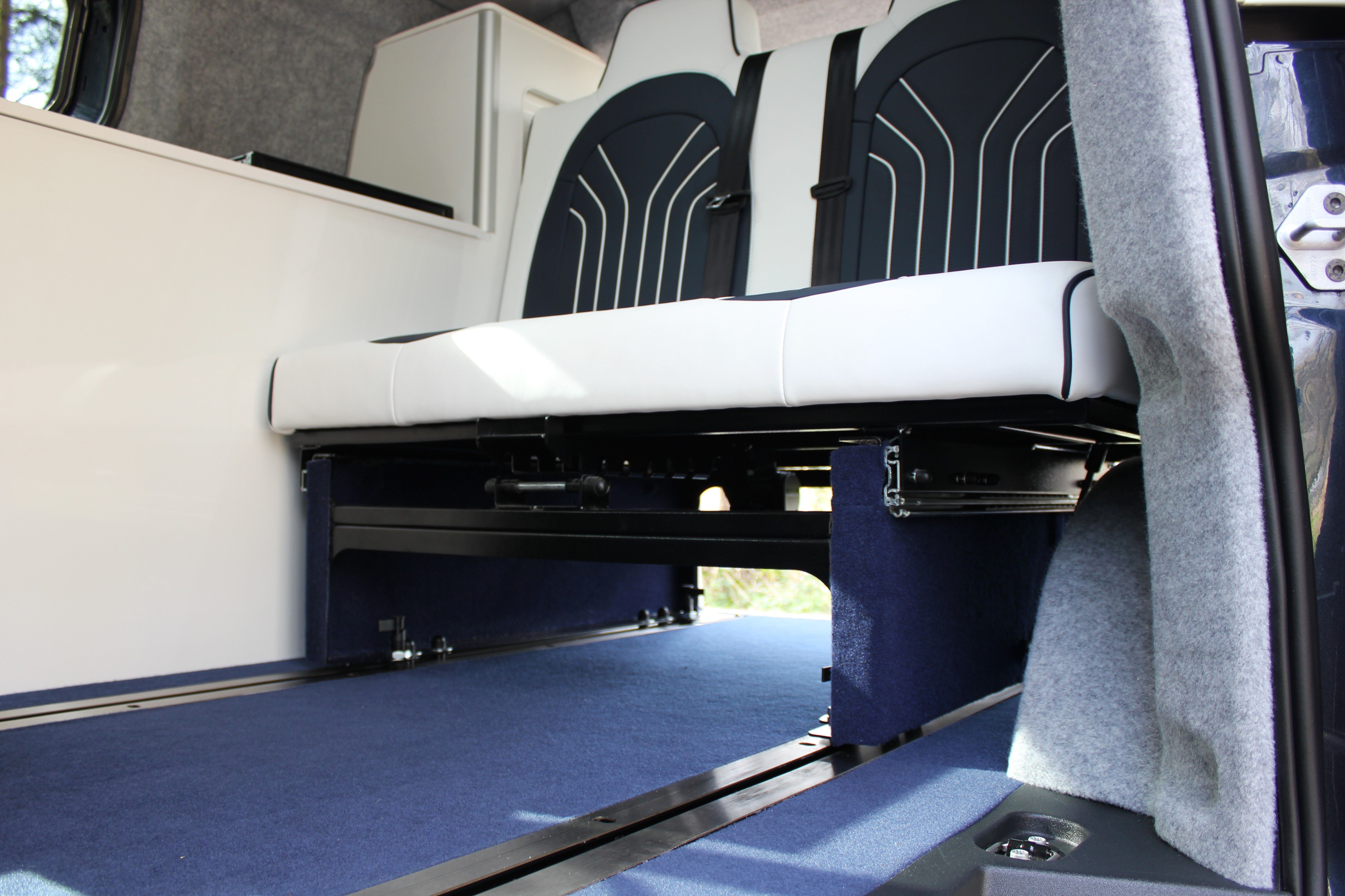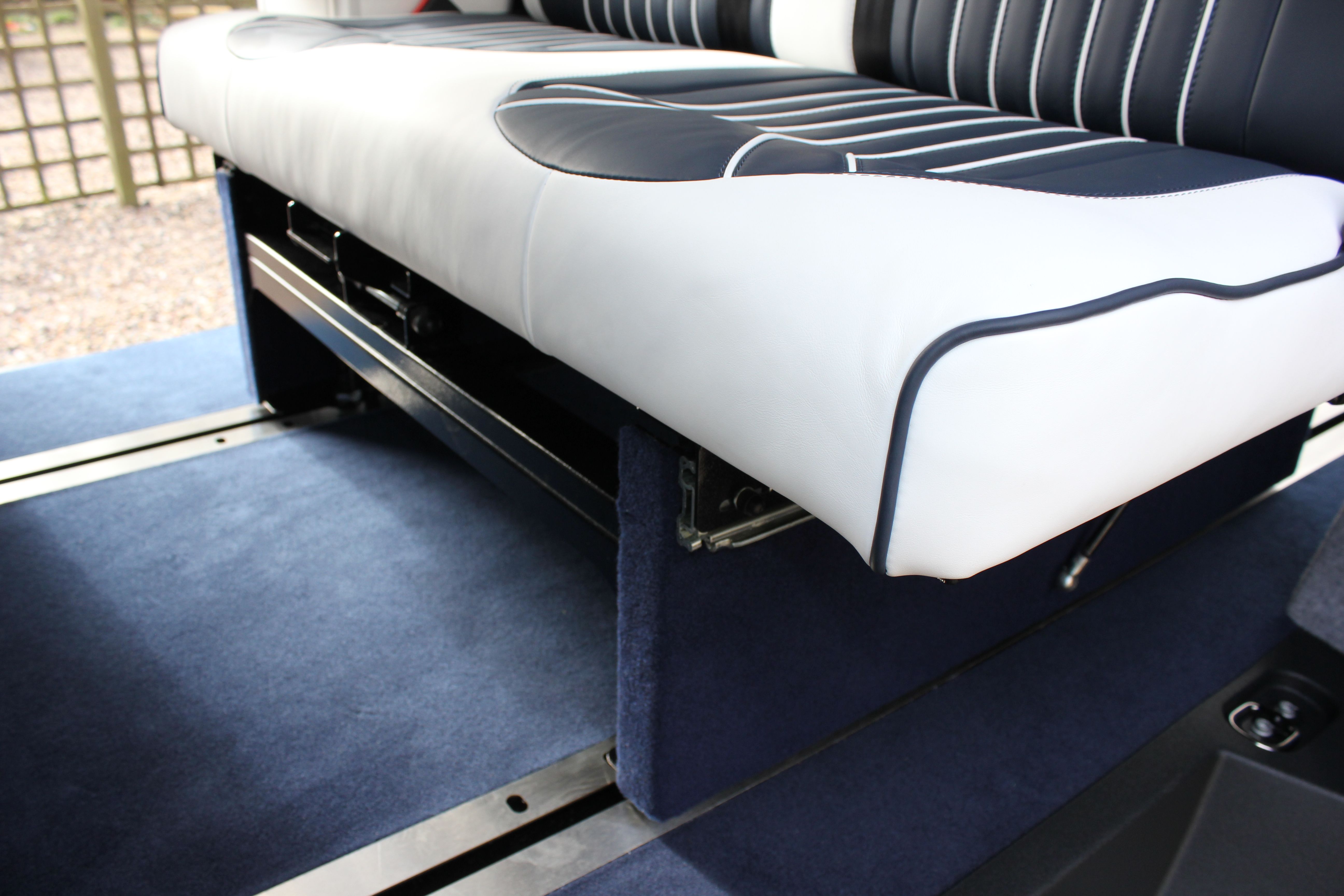 Electric M1 tested 2-seater Rock and Roll bed system upholstered in VW trim, with integrated floor rails