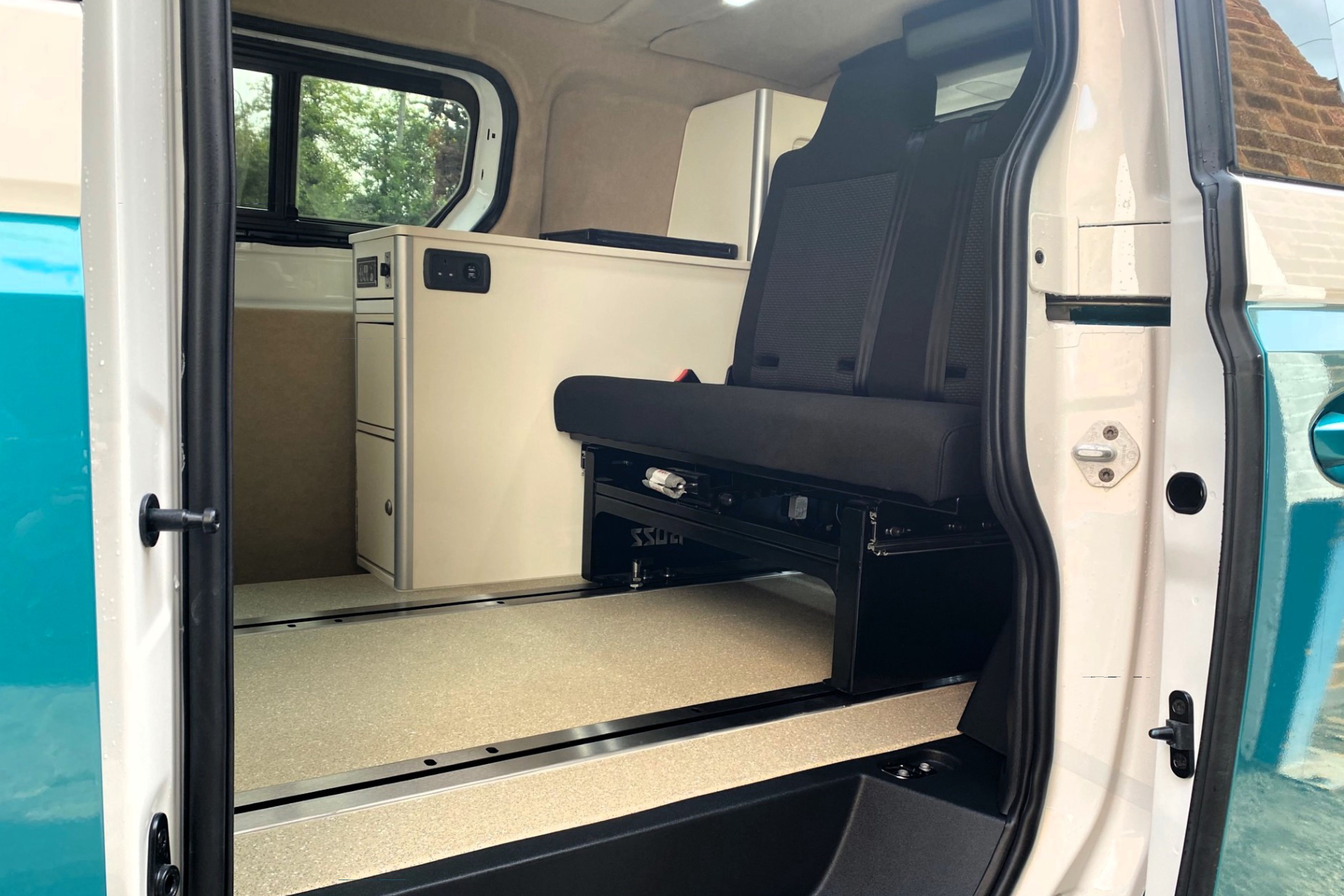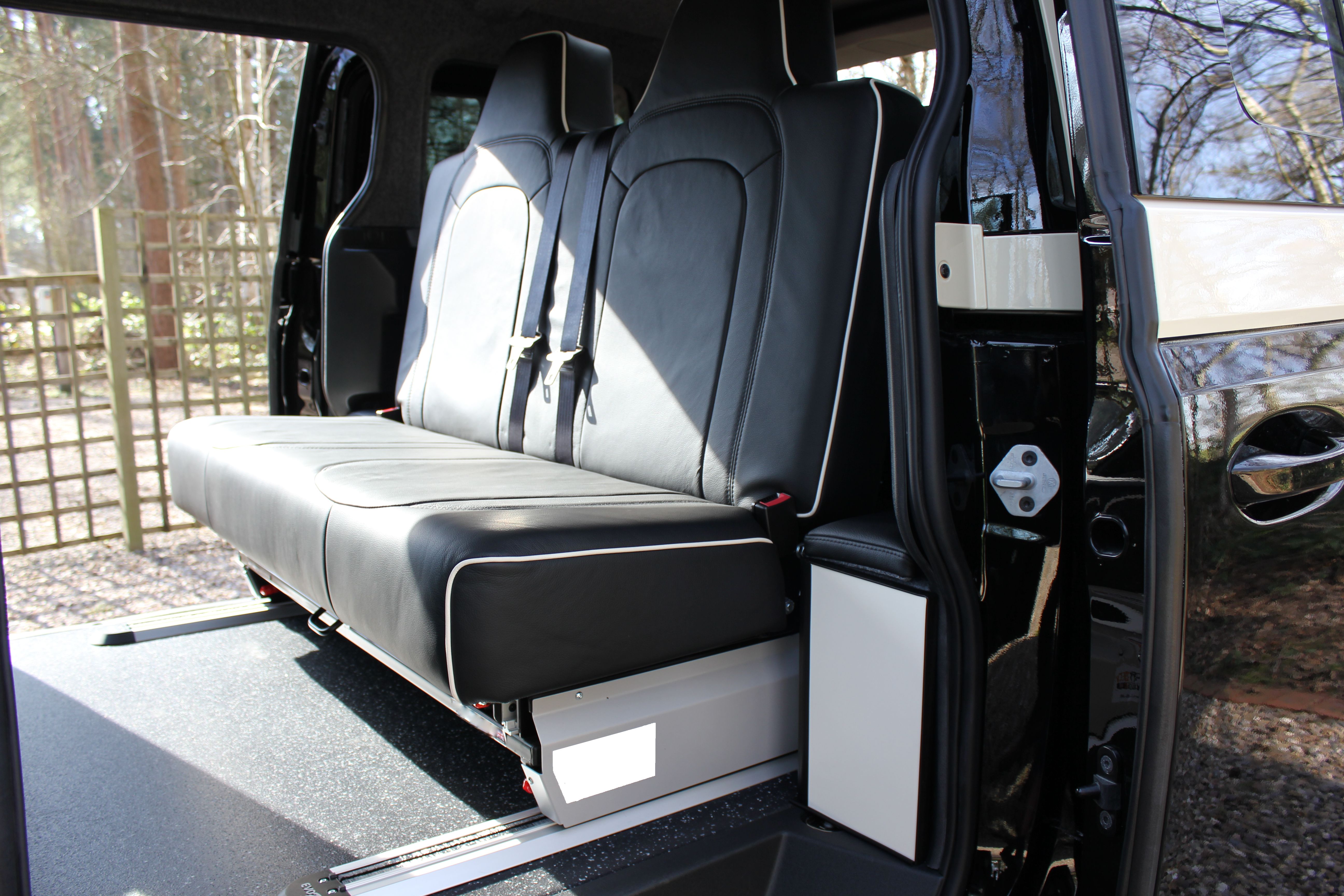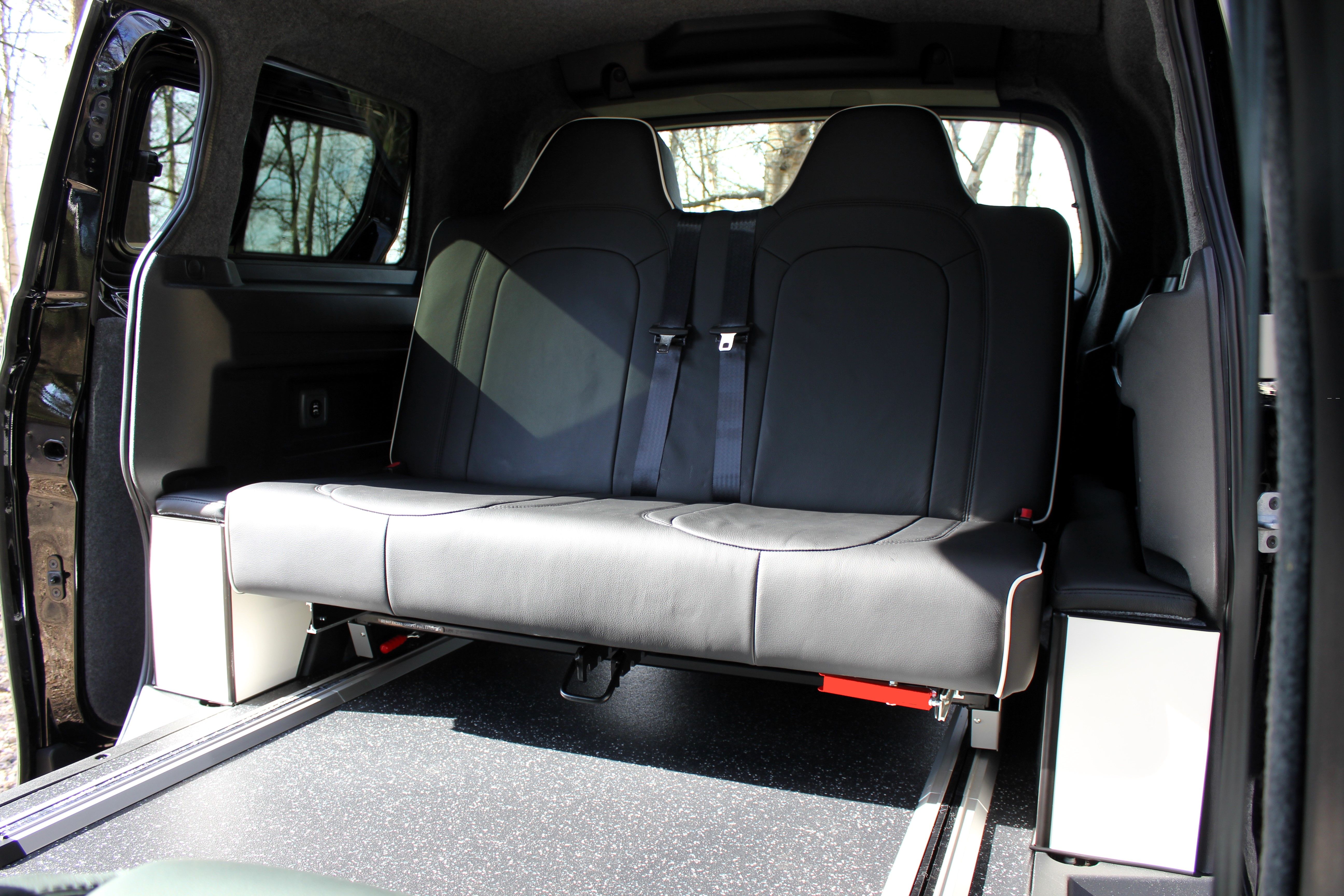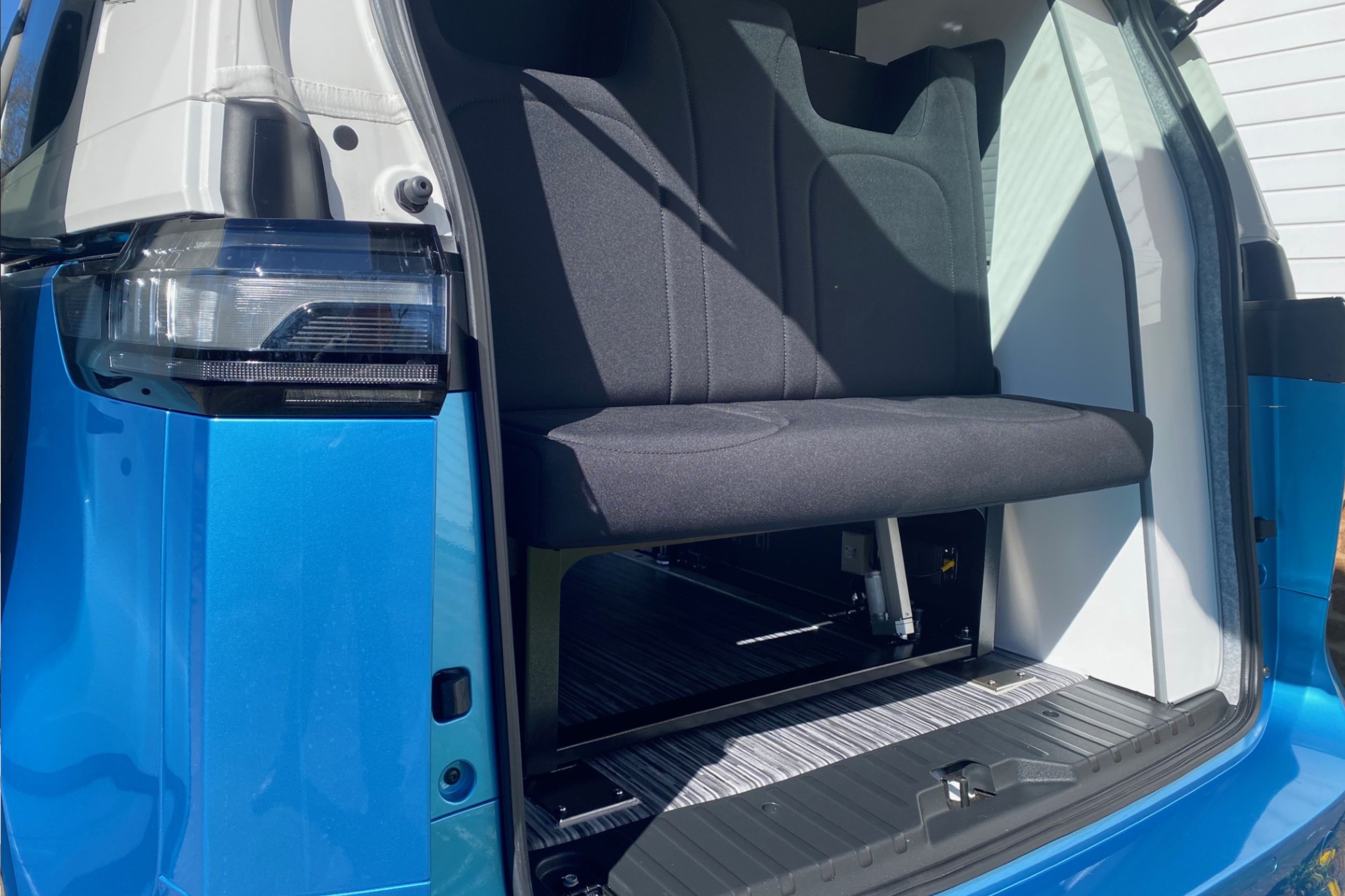 Our Volkswagen ID. Buzz Kombi Sleeper conversion, offering rear travelling seats to a Cargo van in the form of an M1 certified crash tested bed on rail system.