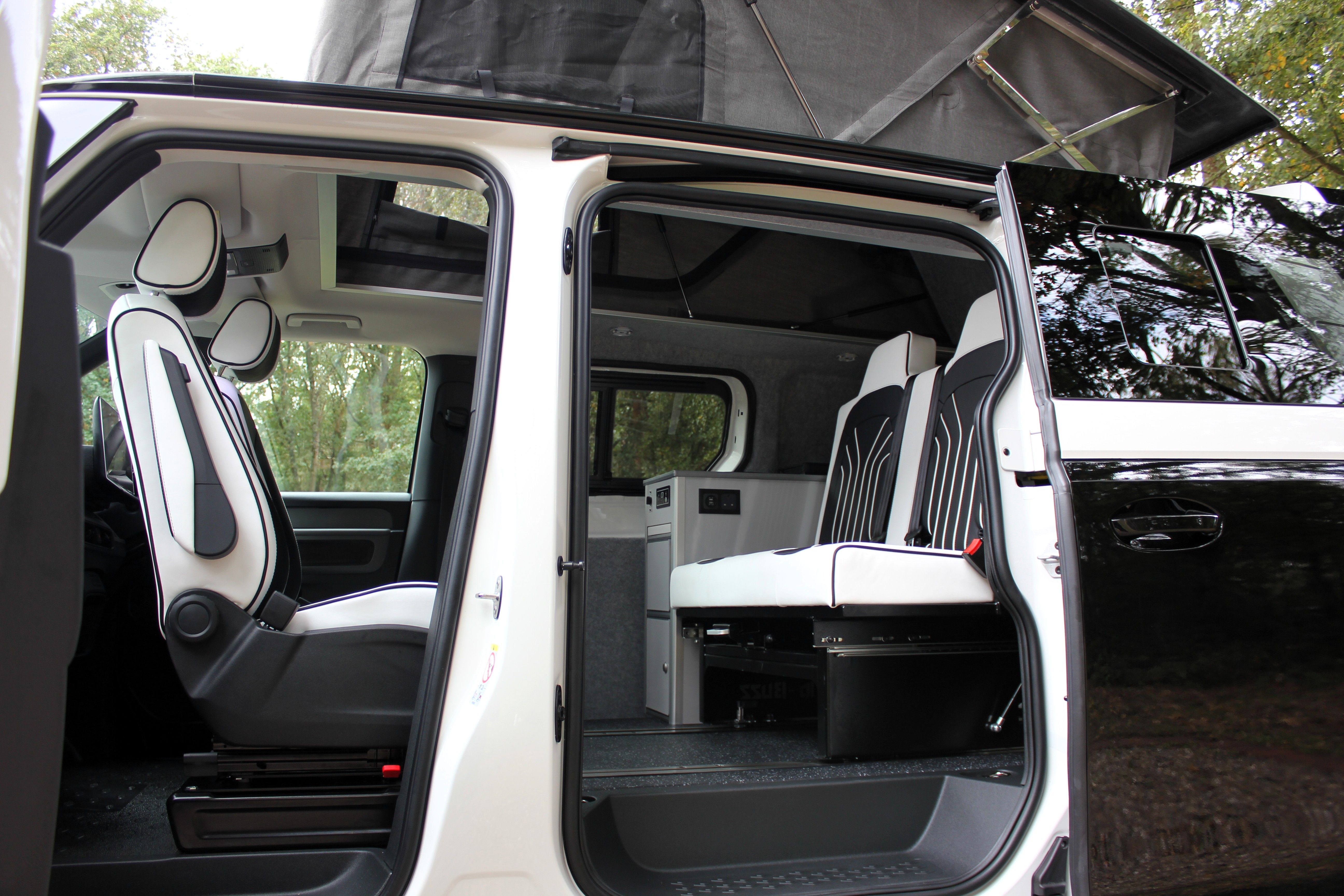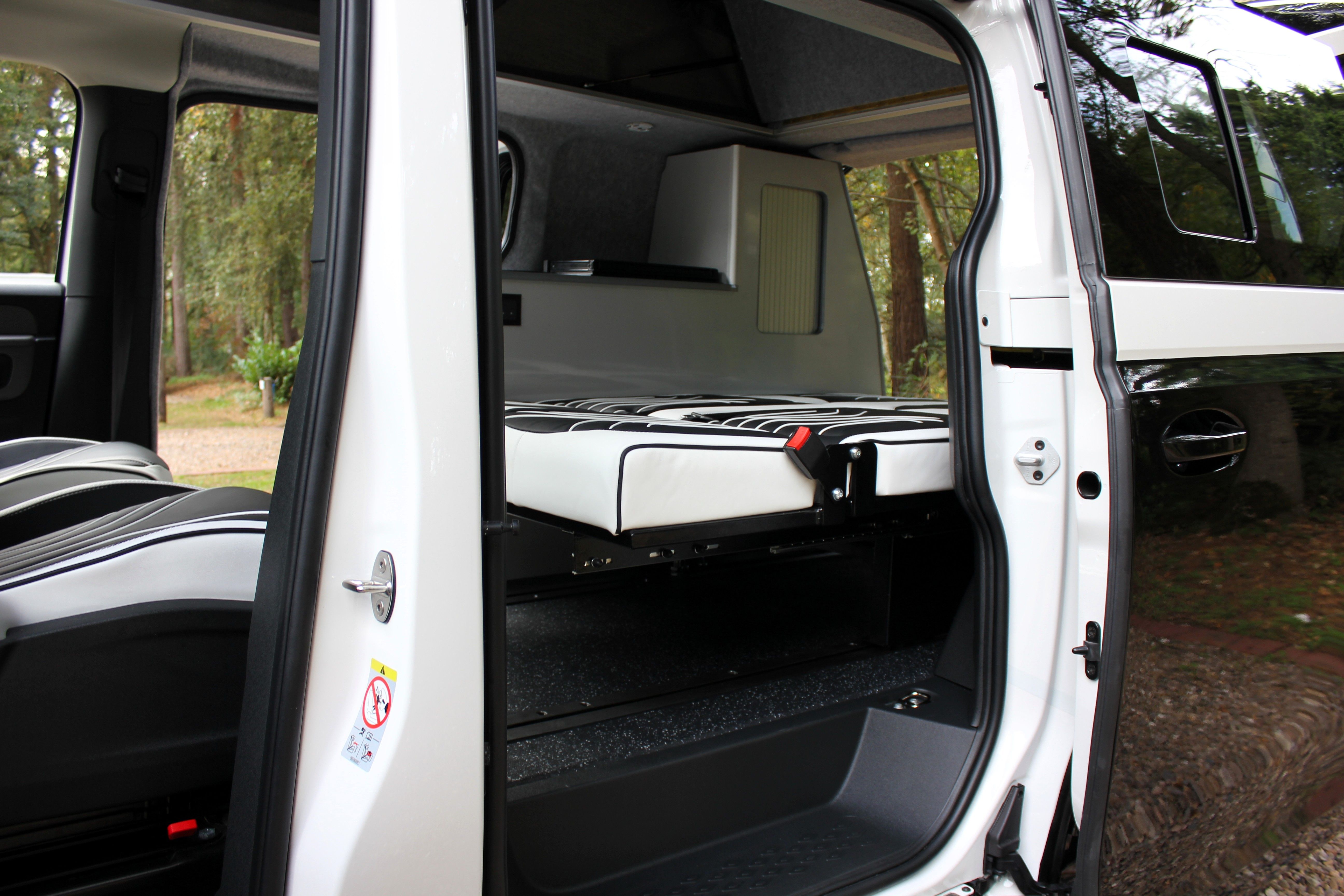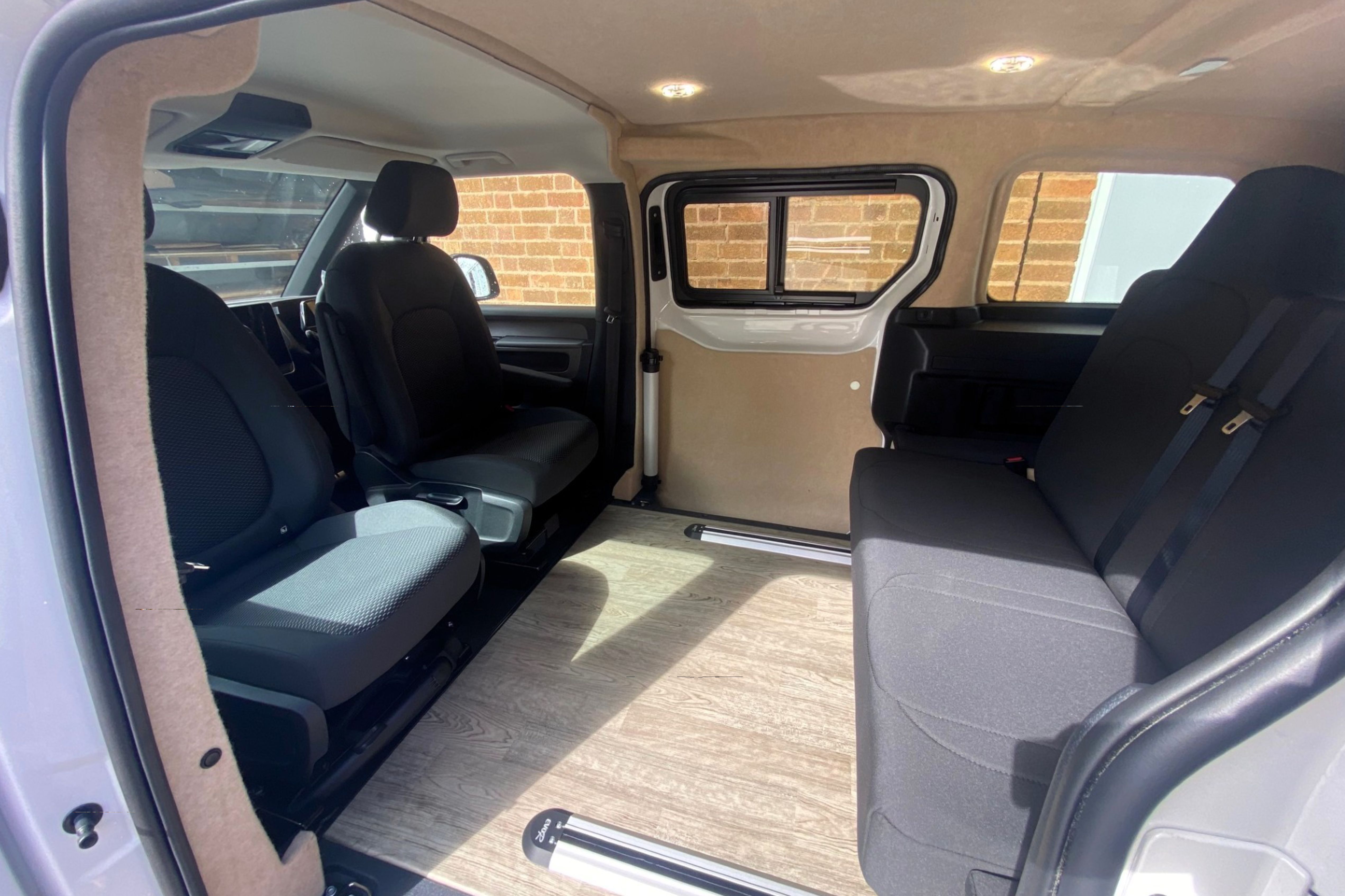 Our Volkswagen ID. Buzz Kombi Sleeper conversion, offering rear travelling seats to a Cargo van in the form of an M1 certified crash tested bed on rail system.