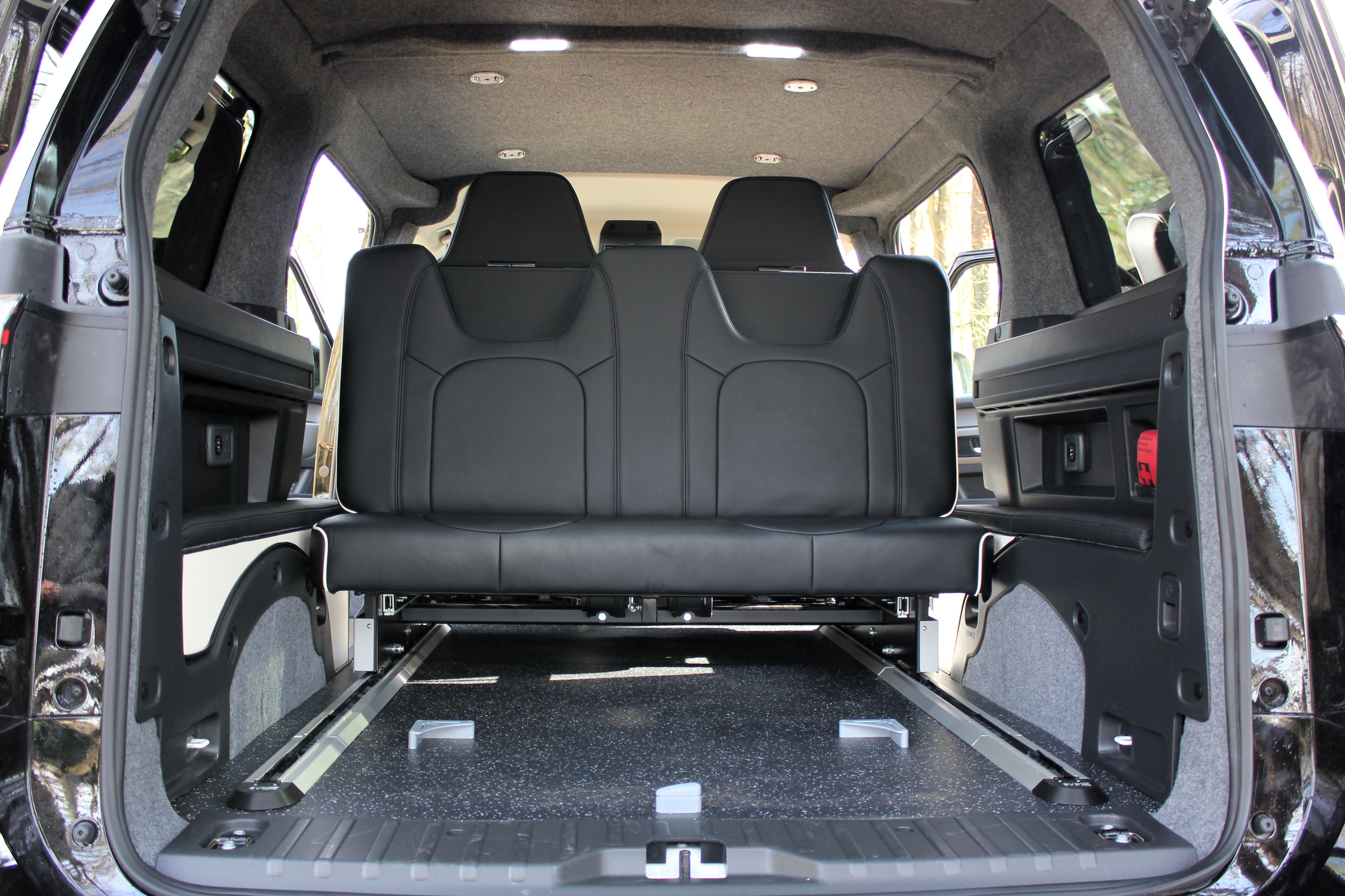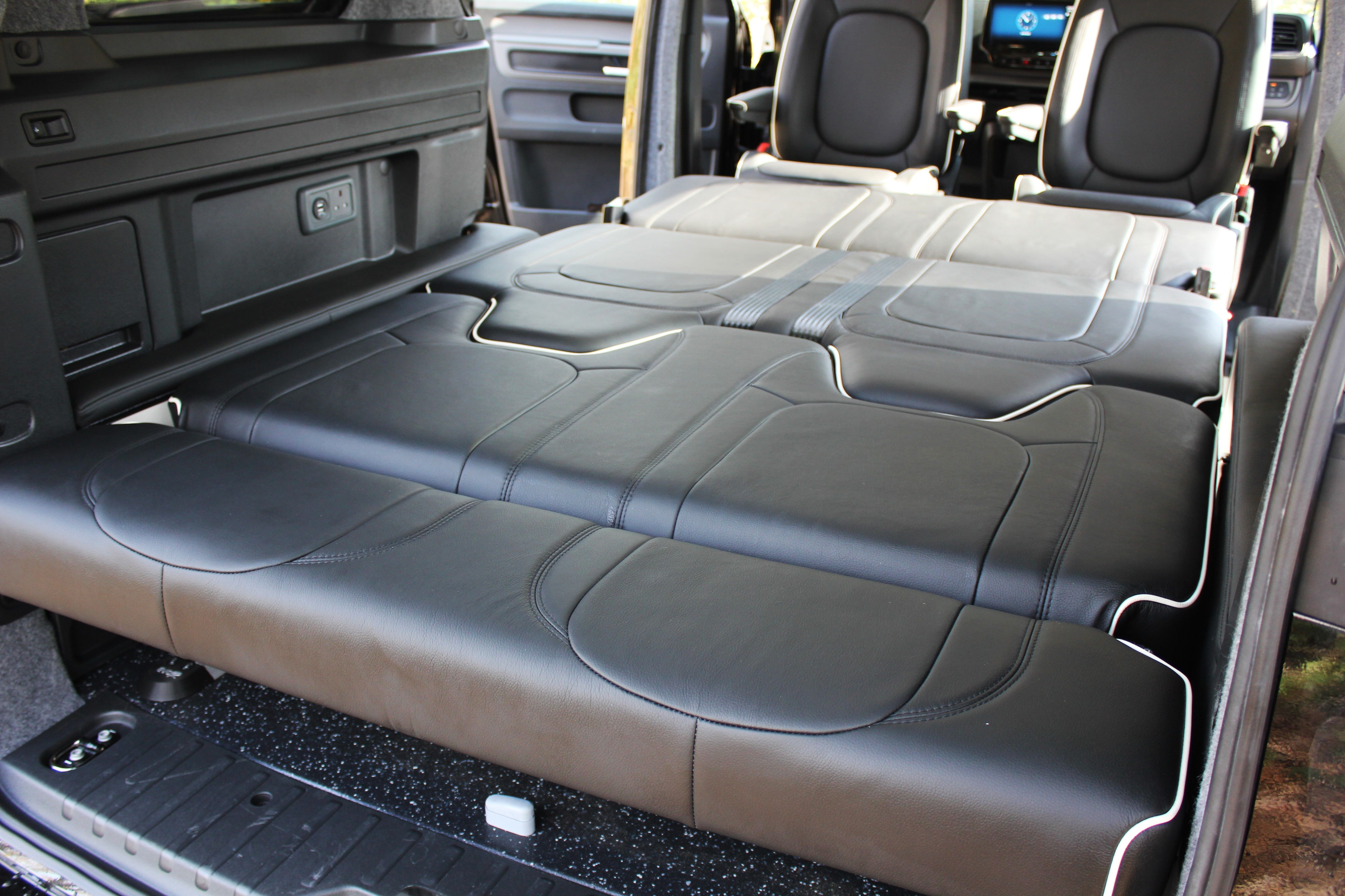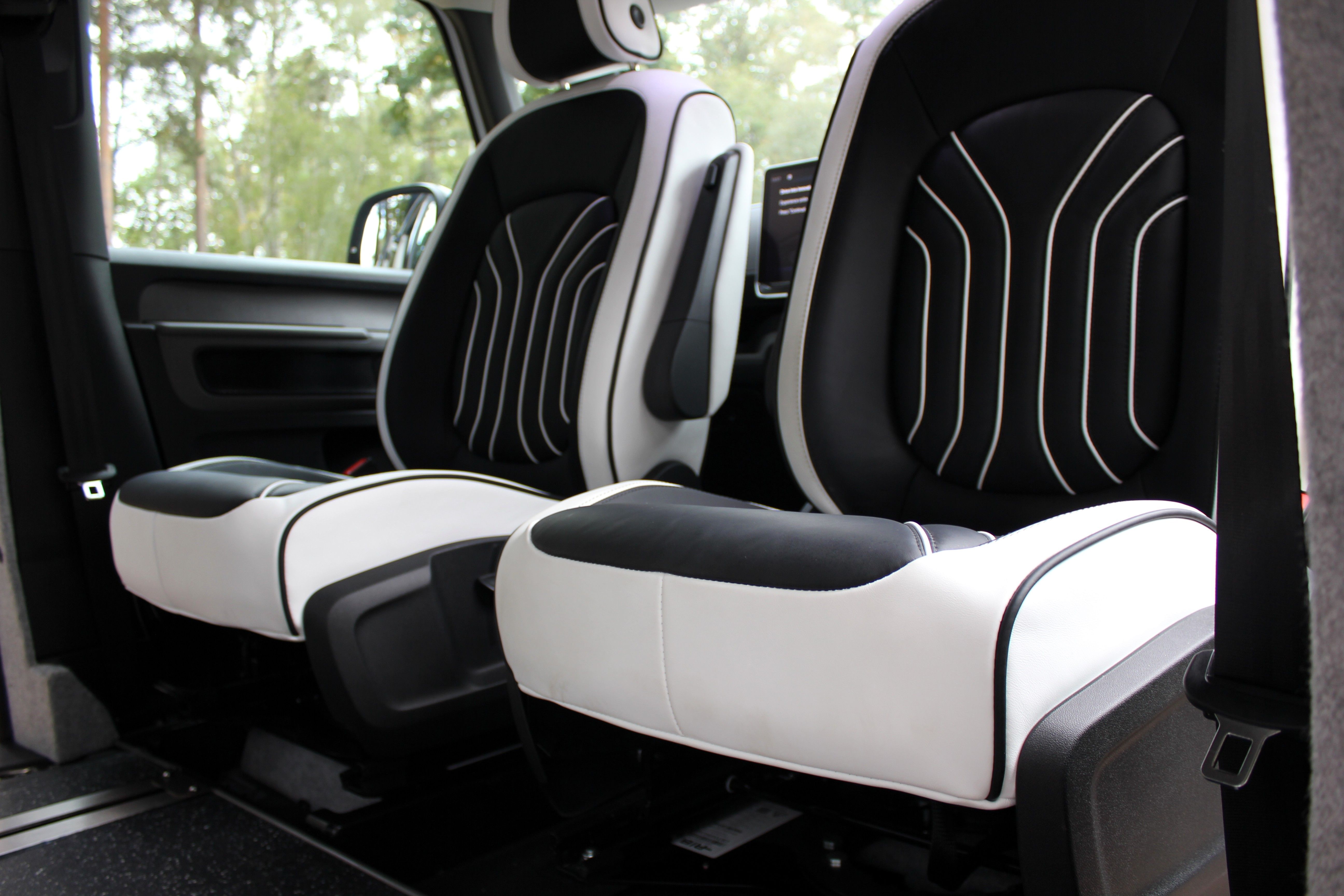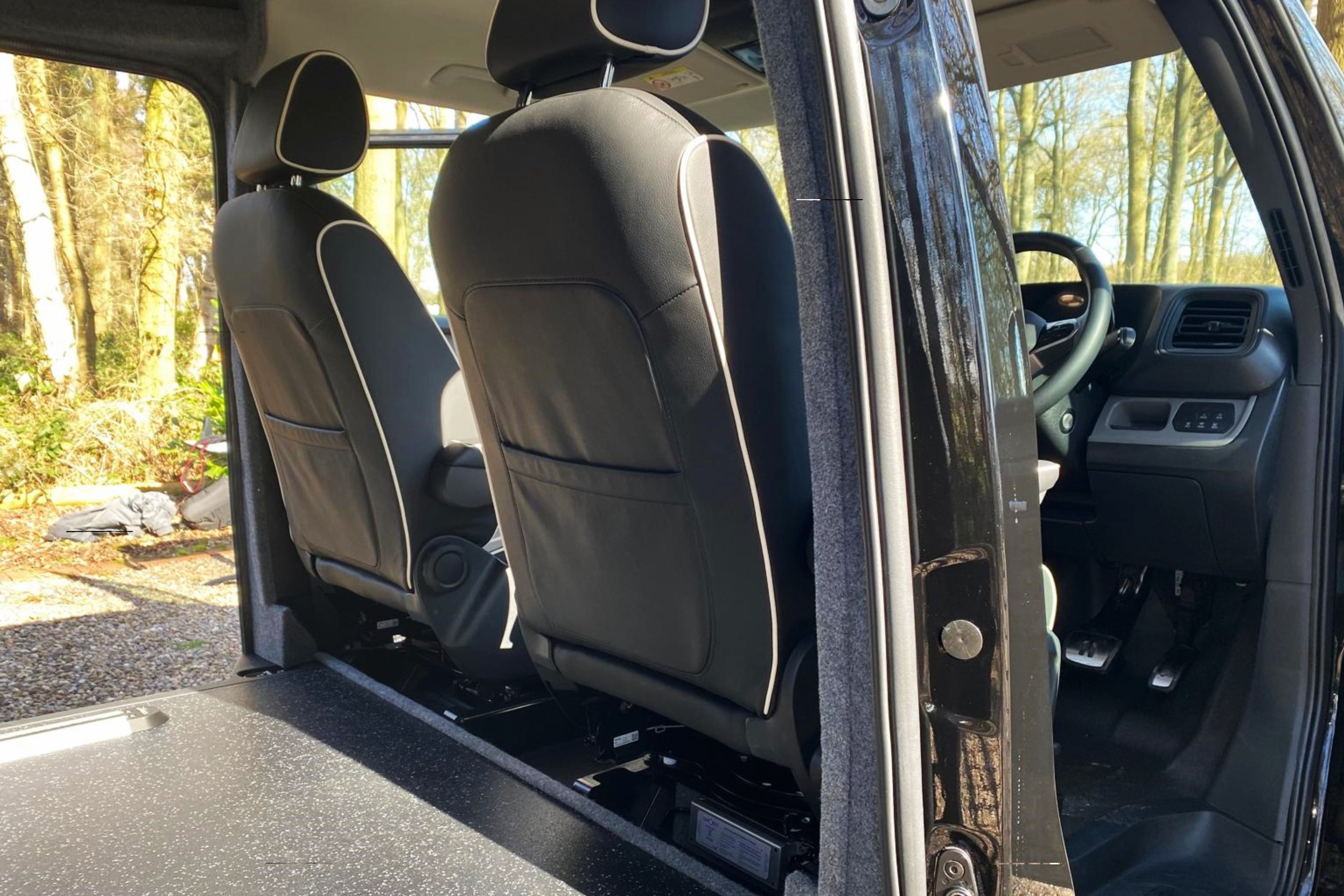 Our Volkswagen ID. Buzz Kombi Sleeper conversion, offering rear travelling seats to a Cargo van in the form of an M1 certified crash tested bed on rail system.