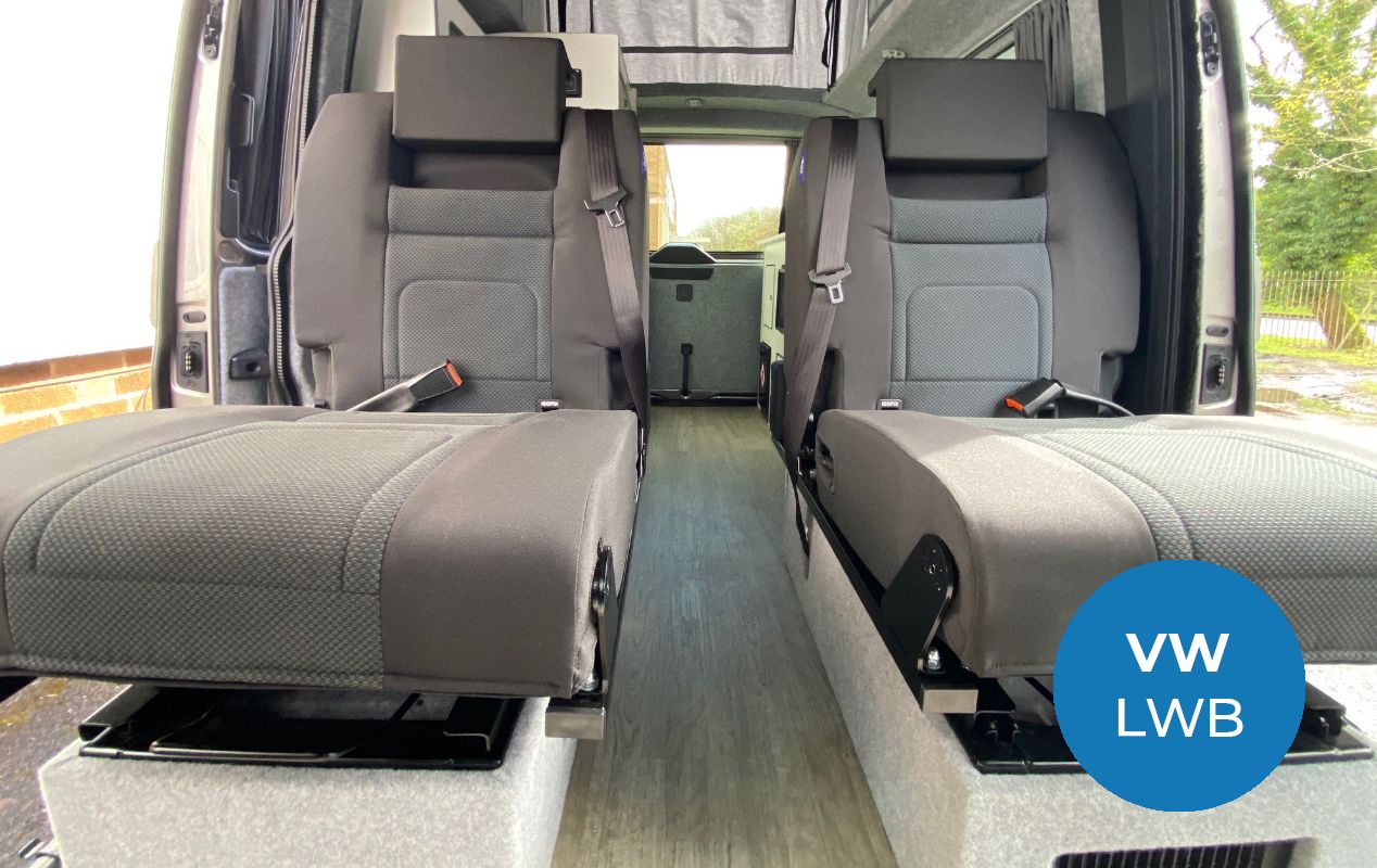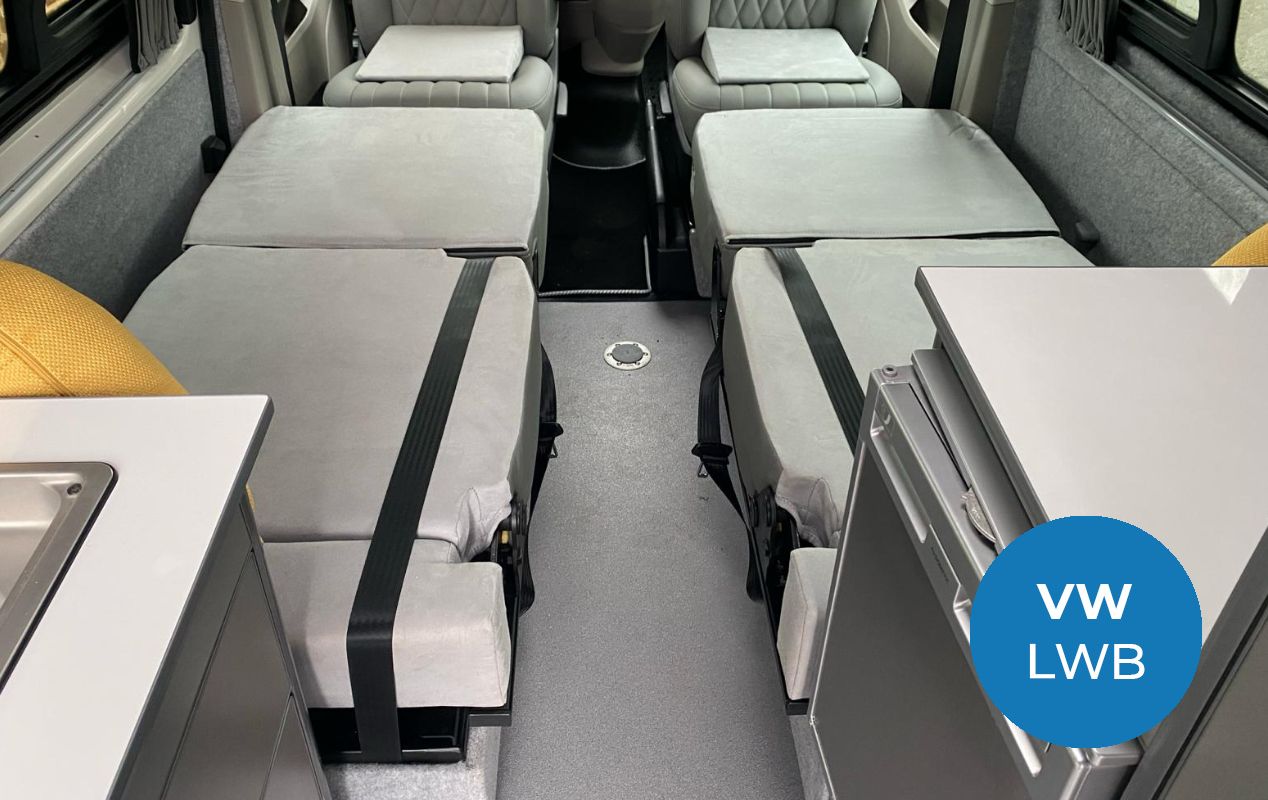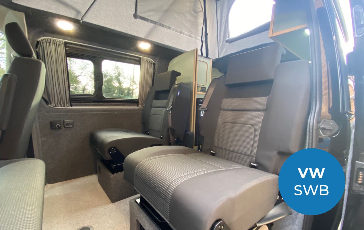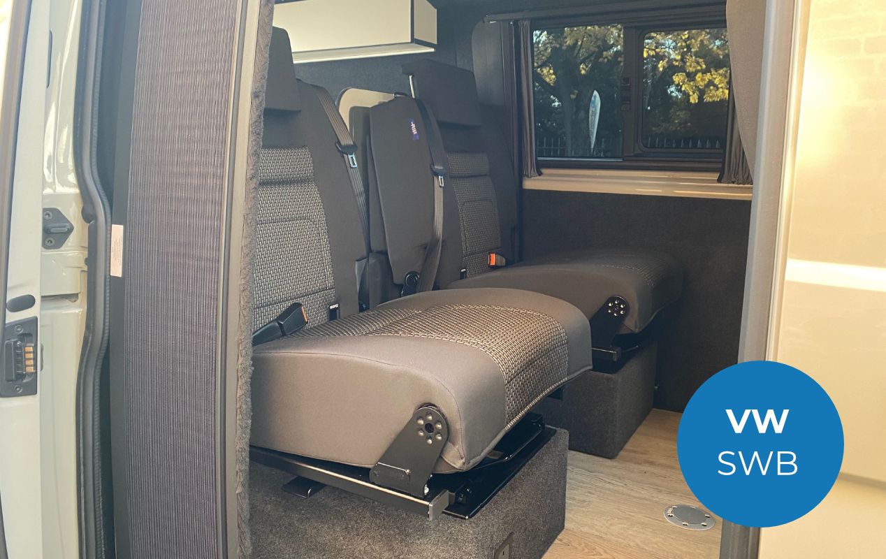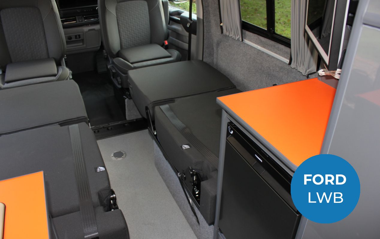 For parents wanting their children to sit closer to them near to the front of the camper or for couples planning a lot of travelling, our rear kitchen campervan conversion layouts make for comfortable wild camping, combined with great ‘go anywhere’ flexibility. With lots of storage space, this 4 or 5 seater, 2 or 4 berth family campervan boasts 2 single Neptune RIB M1 tested beds with sliders and integrated headrests, as standard, whilst offering housing space for a porta potti or fixed flush toilet. Add our heating and hot water system and you can even have a hot shower!