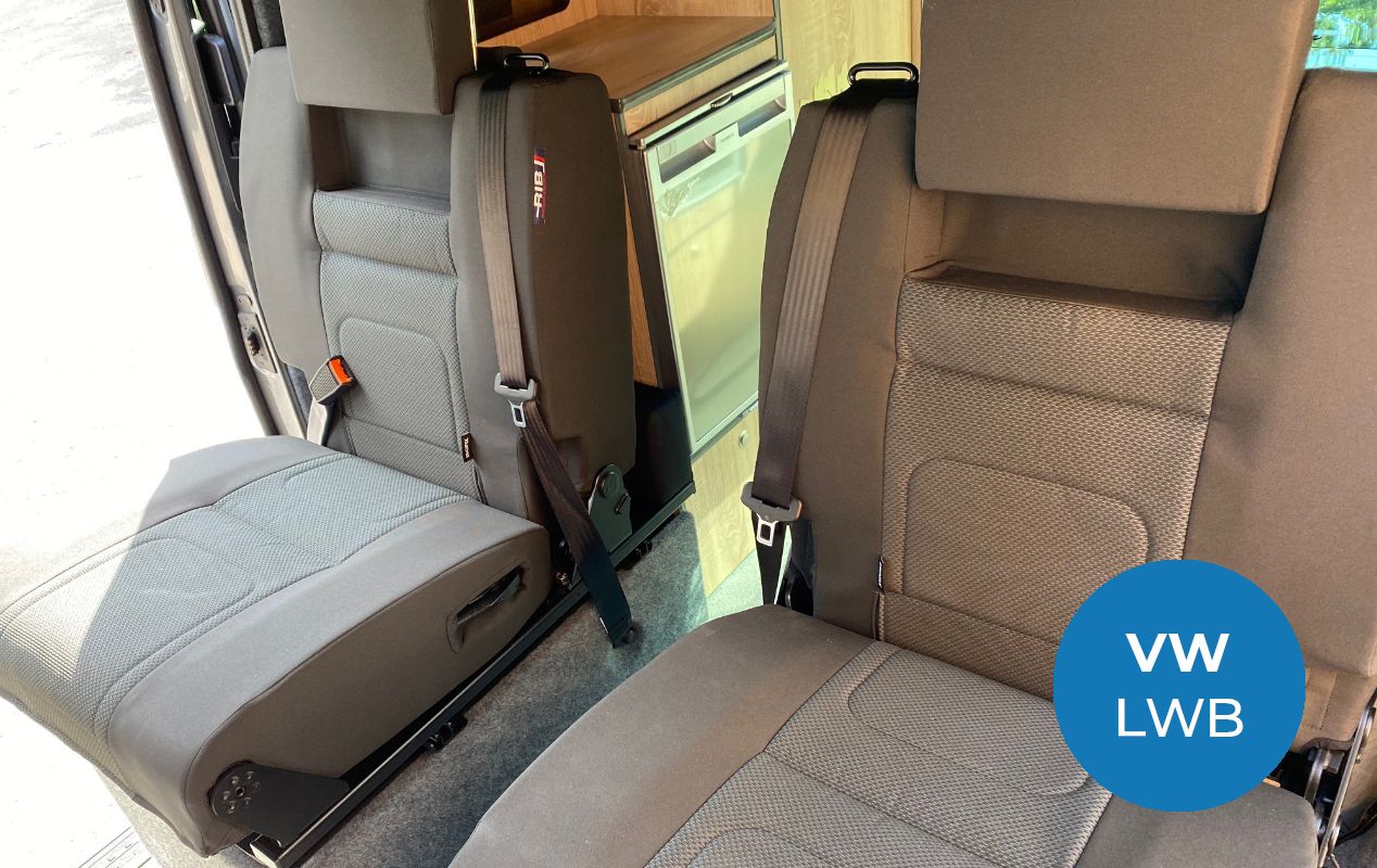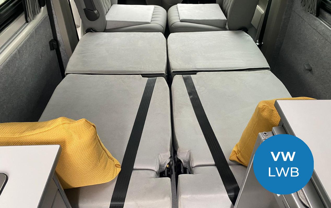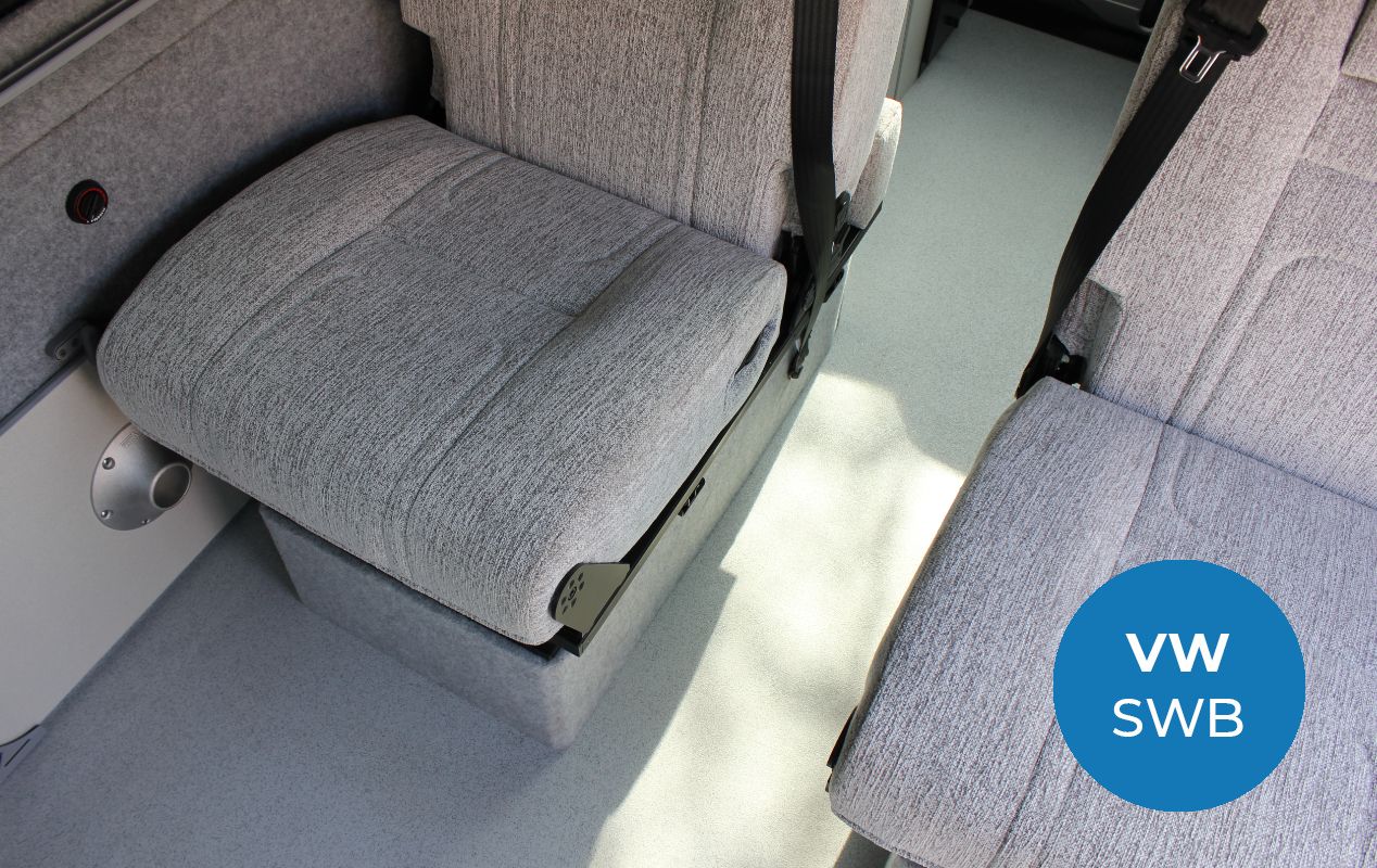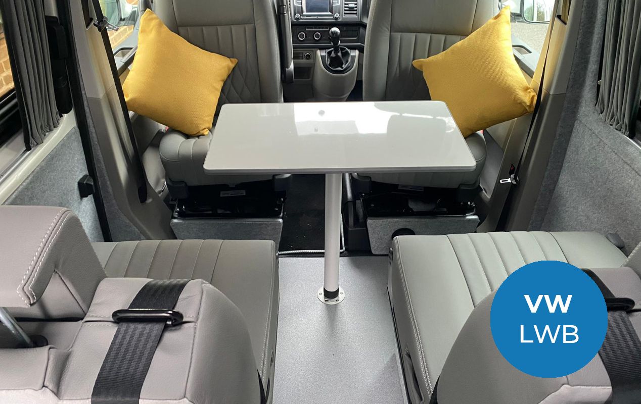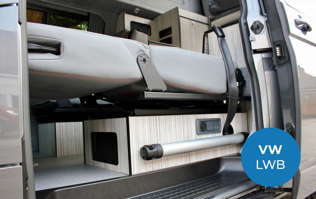 For parents wanting their children to sit closer to them near to the front of the camper or for couples planning a lot of travelling, our rear kitchen campervan conversion layouts make for comfortable wild camping, combined with great ‘go anywhere’ flexibility. With lots of storage space, this 4 or 5 seater, 2 or 4 berth family campervan boasts 2 single Neptune RIB M1 tested beds with sliders and integrated headrests, as standard, whilst offering housing space for a porta potti or fixed flush toilet. Add our heating and hot water system and you can even have a hot shower!