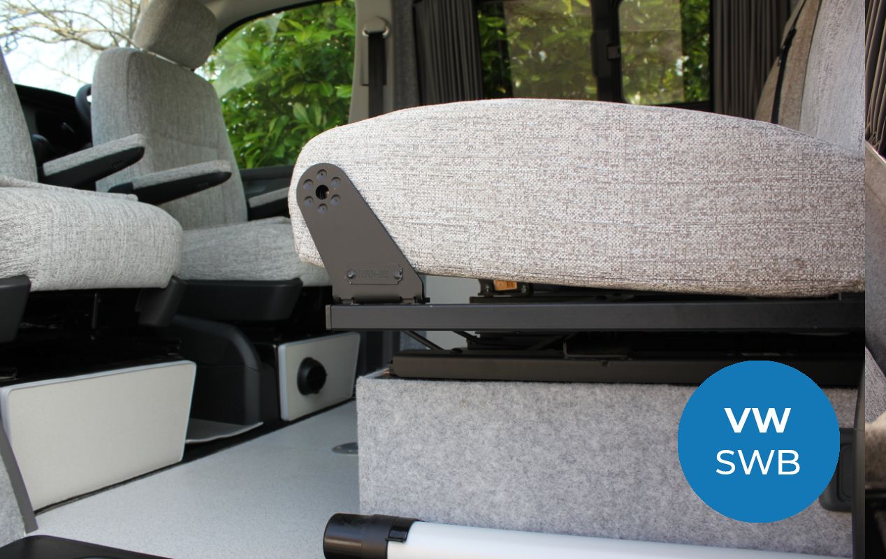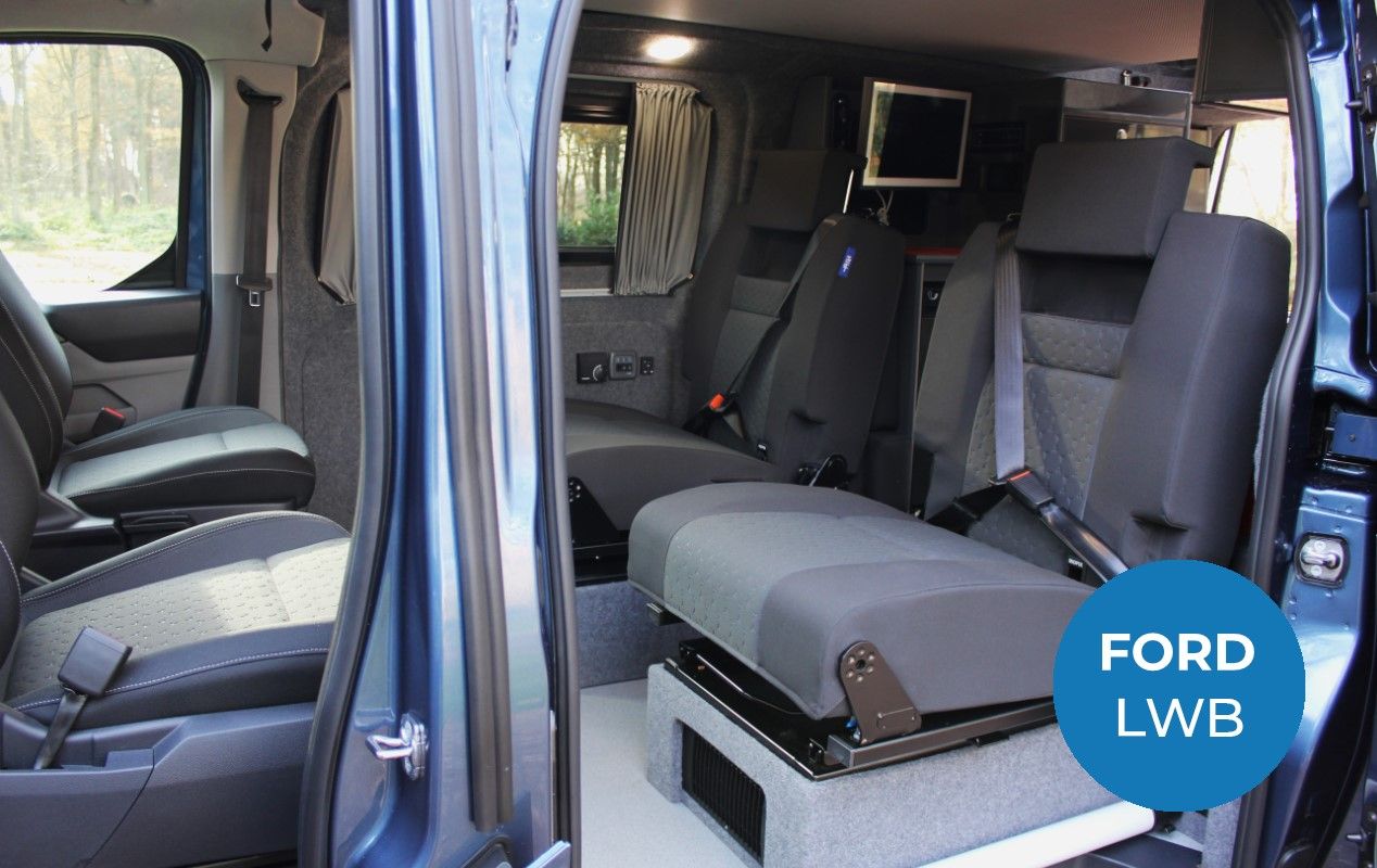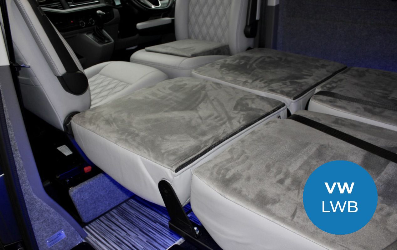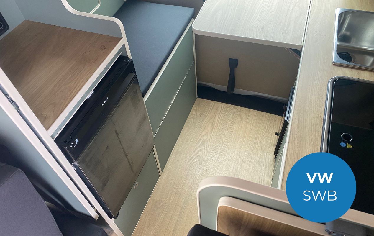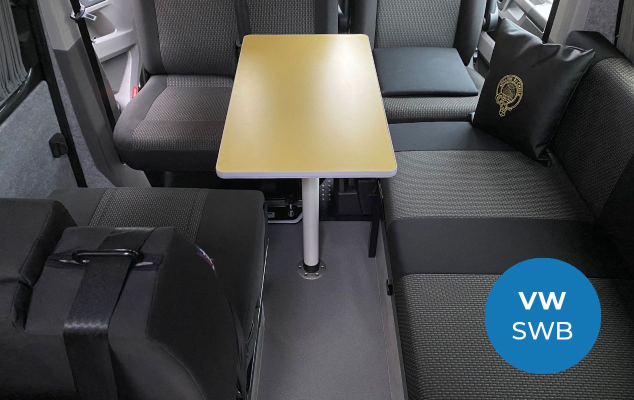 For parents wanting their children to sit closer to them near to the front of the camper or for couples planning a lot of travelling, our rear kitchen campervan conversion layouts make for comfortable wild camping, combined with great ‘go anywhere’ flexibility. With lots of storage space, this 4 or 5 seater, 2 or 4 berth family campervan boasts 2 single Neptune RIB M1 tested beds with sliders and integrated headrests, as standard, whilst offering housing space for a porta potti or fixed flush toilet. Add our heating and hot water system and you can even have a hot shower!