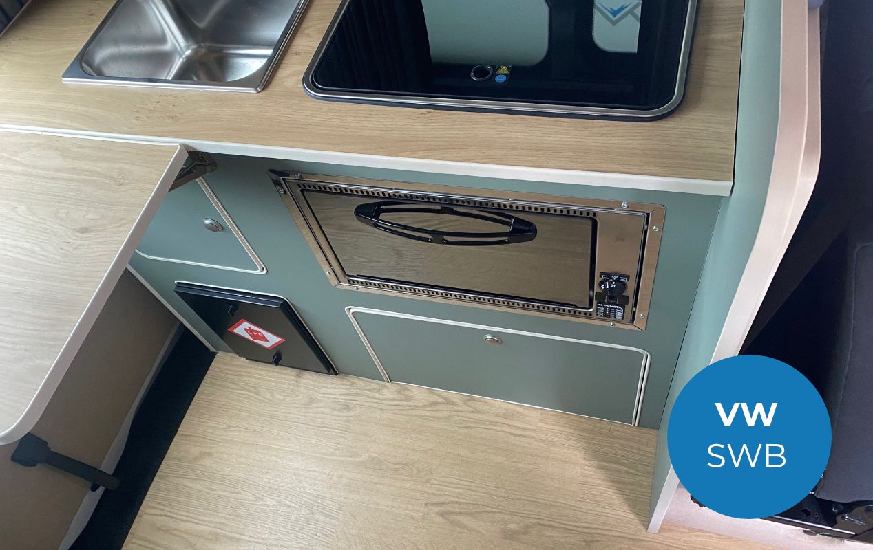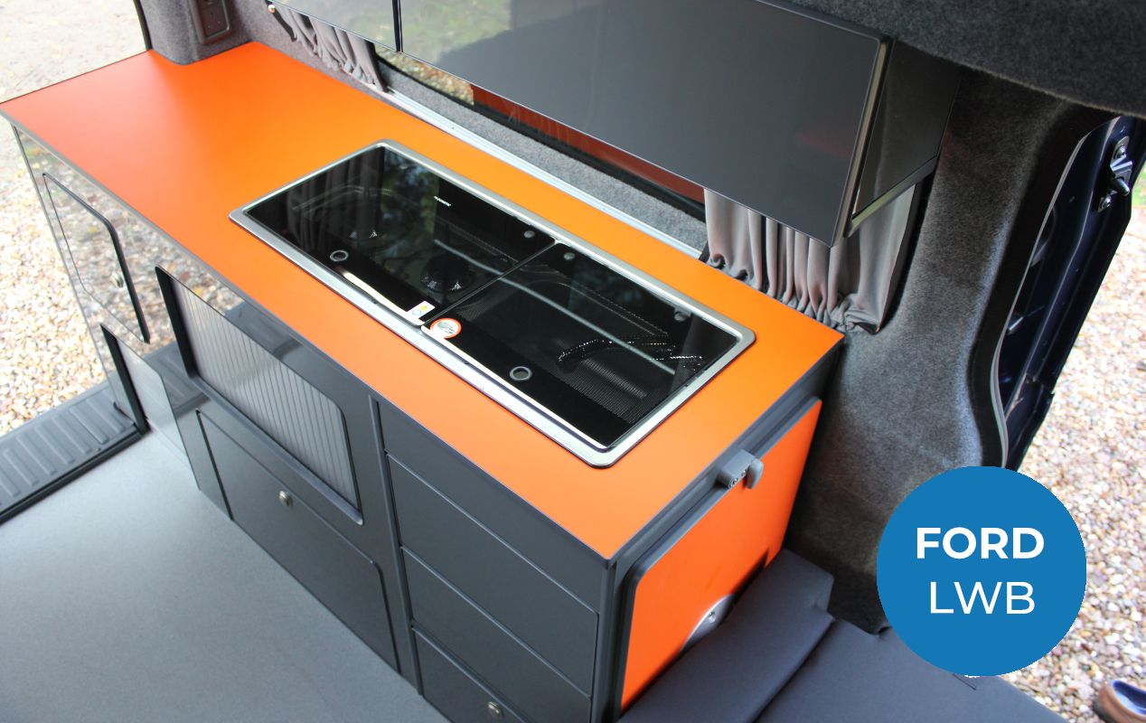 Our Harvington self sufficient camper conversion layout features a rear kitchen area, to offer a more flexible camping layout. Our flagship design developed by us since 2012, with a reverse style layout and rear elevating roof this layout allows for more room at the rear of the campervan giving you a large rear galley style kitchen area with lots of cupboards space. There’s even space for a fitted flush toilet!